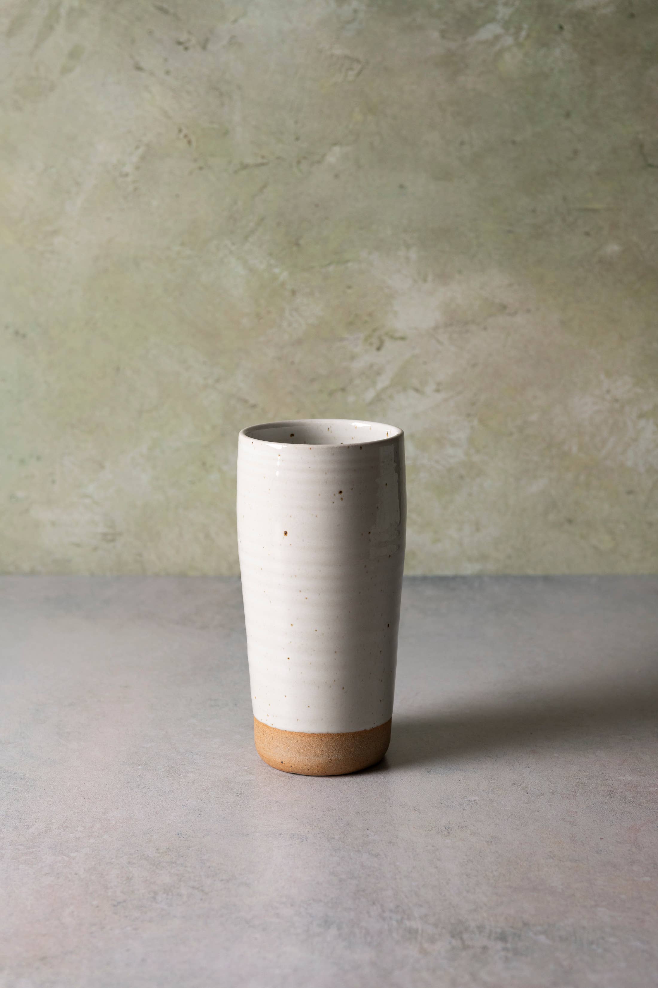 Hand thrown ceramic cup with an indentation for the thumb. Perfect for juice, cocktails or water. Holds approximately 12 ounces. Approximately 3.25" wide by 4" tall. Microwave, dishwasher, oven safe. Hand thrown, hand glazed. Expect slight variations in dimensions and color. Great for lattes, coffee with cream and hot beverages that have been allowed to cool to 165 degrees or lower. If you like your coffee black or use boiling water for tea, this cup may be hot to the touch. Allow to cool for a few minutes, or check out our handled mug! Please note: As an artisan business, we do not always have items in stock. We make each piece of pottery by hand, from scratch on the potter’s wheel.
