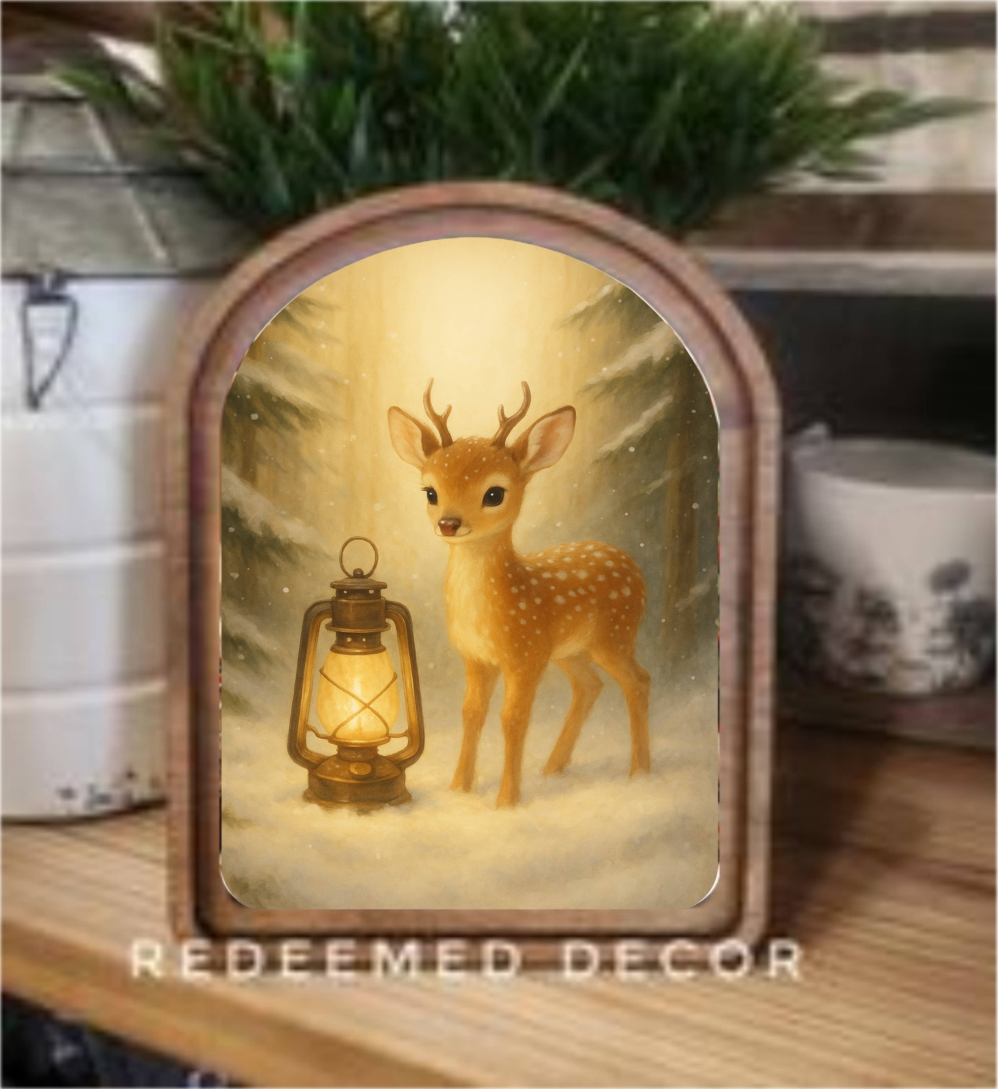 This enchanting art print features a fluffy orange fox peeking playfully from behind lush green pine branches, accented with large pine cones. Vintage lanterns hang from wooden posts, casting a warm glow that lights up the snowy forest backdrop, where tall pine trees are dusted with fresh snow and flurries fill the air. Perfect for your entryway. • Printed with vivid colored inks on cotton canvas mounted on wood • Solid hardwood frame in shown stain colors • Sustainable American sourced wood • Made in the USA in our Utah studio • MINI 6" tall x 6" wide x 1.25" deep w/ 1/4" thick frame • SMALL 11" tall x 11" wide x 1.25" deep w/ 1/4" thick frame • MEDIUM 15" tall x 15" tall x 1.5" deep w/ 3/4" thick frame • LARGE 22" tall x 22" tall x 1.5" deep w/ 3/4" thick frame • Signs may have +/-1" variations • All signs can stand on a shelf or table (Medium & Large can also hang on a wall) • Farmhouse style frames have small rustic imperfections that make them unique