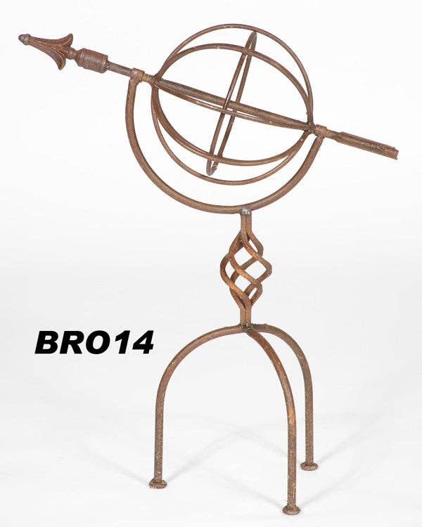 Heavy solid iron 12" globe sundial. Cast iron piece in the middle and finial. Ships as 1 piece welded together with Solid Iron. This is one of the oldest products we sell continuously. Perfect for any yard. Available in various colors or just plain old rust with no finish. Measures 34" to top of finial with the sphere at 12". The legs do spread out to 18" apart. The legs do spread out to 18" apart.