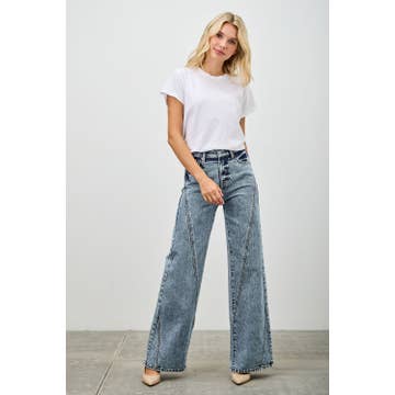 OPEN PACK MID RISE CROPPED WIDE LEG JEANS MEDIUM STONE WASH ZIPPER FLY COMFORT STRETCH UNEVEN FRONT WAISTBAND CUT SEAM AND RAW HE, LINE DETAIL AT FRONT CUFFED W/RAW HEM RISE 9 1/4" INSEAM 27"(CUFFED) IN SIZE 5/26 84% COTTON, 15% LYOCELL, 1%SPANDEX, 11.75 OZ