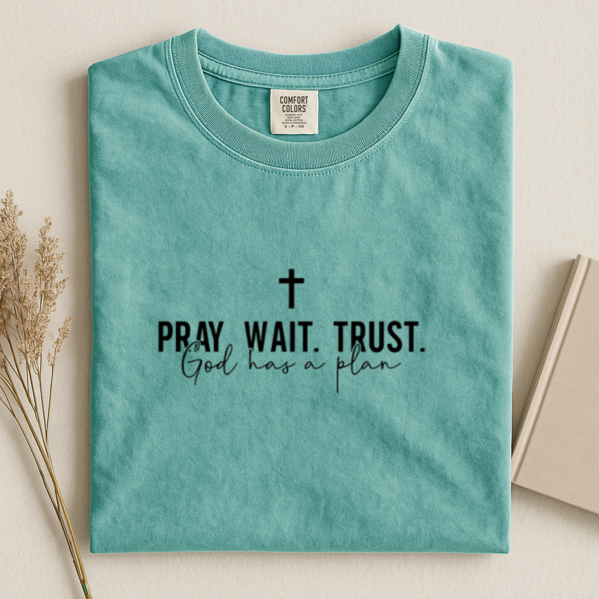 "Pray Trust Wait" soft and comfy t-shirt. This Comfort Colors shirt is awesomely soft!! This shirt is of a unisex design, featuring an irresistibly soft combed and ring-spun cotton blend, crew neck and short sleeves. We design our jewelry and apparel to bless others in a personal way, and in return we are being a blessing to those in need by donating a portion of the proceeds not only to orphanages in Haiti and India, but also to local organizations who strive to bring hope to their communities. Sizing and Specifications * 6.1 oz., pre-shrunk 100% ringspun cotton * Soft washed garment dyed fabric * Double-needle stitching on neck, sleeves and bottom hem * Twill taped neck and shoulders * Double needle armhole, sleeve and bottom hem * Short Sleeve * Crew neck * Printed in Georgia, USA * Fit: Unisex runs true to size * Sizes: Small thru XX-Large. See attached sizing guide. * Care Instructions: Machine wash cold, inside out, with like colors. Only non-chlorine bleach. Tumble dry low. Medium/hot iron. Do not dry clean.