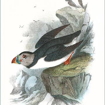 Print of original watercolor painting, 'Dancing Puffin'. Prints arrive packaged individually with a sturdy chipboard backing inside a protective sleeve, ready to be placed on your shelves. Artist information is on the back of the packaging. Prints are available as 11"x14" (medium) and 5"x7" (small) Minimum quantity is 10 per design/style.