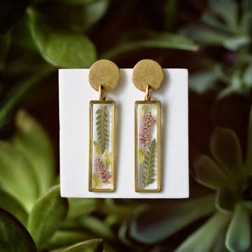 Pressed pink daisy on resin wrapped in a brass frame. Beautifully imperfect earring. Each earring is unique as each rose. Not too heavy. Pressed flower gifts. Pressed flower art. Wild Dogwood Jewelry Unique gift, boho earrings, cute earrings, unique earrings, one of a kind gift, boho jewelry, gift for her, quick shipping, beautiful jewelry. Greenery and size of rose may vary from picture.