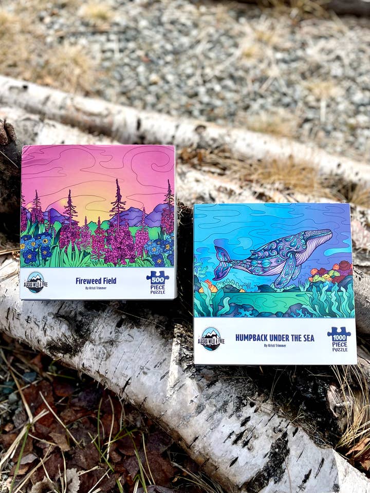 500 Piece Puzzle - 16x20 inches Fireweed Field captures the beauty of the Fireweed and Forget Me Not flowers in the midst of the morning's alpenglow. A wonderful view to brighten up the day. Alaska Wild & Free puzzles are made in the US with 100% recycled premium Eska board. Each puzzle contains a full-color illustration of the puzzle's beautiful design. The box has a nice soft closure and makes a wonderful gift.