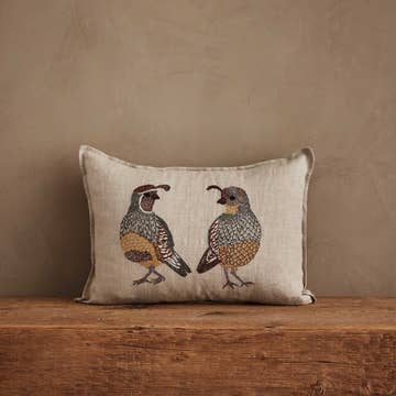 Desert Quails, also known as Gambel’s Quails, are found in the American Southwest. The unique plume of feathers on top of their heads sets them apart from California Quails. Celebrate this remarkable bird with our Desert Quail Love pillow that features a pair embroidered with intricate plumage in golden yellow, brown, and gray. Embroidered on 100% linen fabric. Back fabric is 100% linen. Unbleached, undyed, and Oeko-Tex Standard 100 certified. 12" × 16"