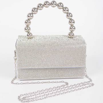 Enamel Charm Chain Pointed Faux Leather Pearl Pointed Chain Mini Bucket Bag • Size : 6" X 5.5" X 3.5" • Strap Size : 43" L / Detachable • Top Handle Chain Size : 1.25" H, 10.5" L