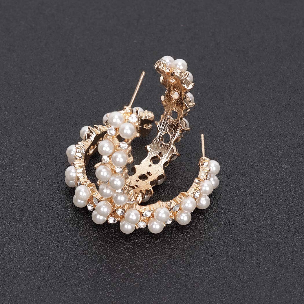 1.5" Pearl Accents Hammered Gold Toned Metal Hoop Earrings