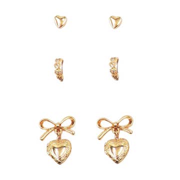 Heart Drop Pearl Studded Hoop Trio Earrings, this set includes three chic designs: elegant pearl-studded hoops, delicate heart drop accents, and versatile styles perfect for layering or standalone wear. The titanium posts ensure durability and hypoallergenic wear, making them suitable for sensitive ears. Hypoallergenic post Surgical steel post Lightweight post Durable post Product details: width: .5" - .75" length: .5" - .75" earring back: Titanium Post metal finish: gold Plating product: Lead & Nickel Compliant anti-tarnish: Double E-coating