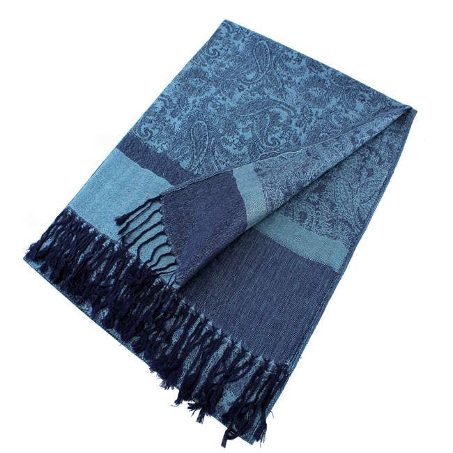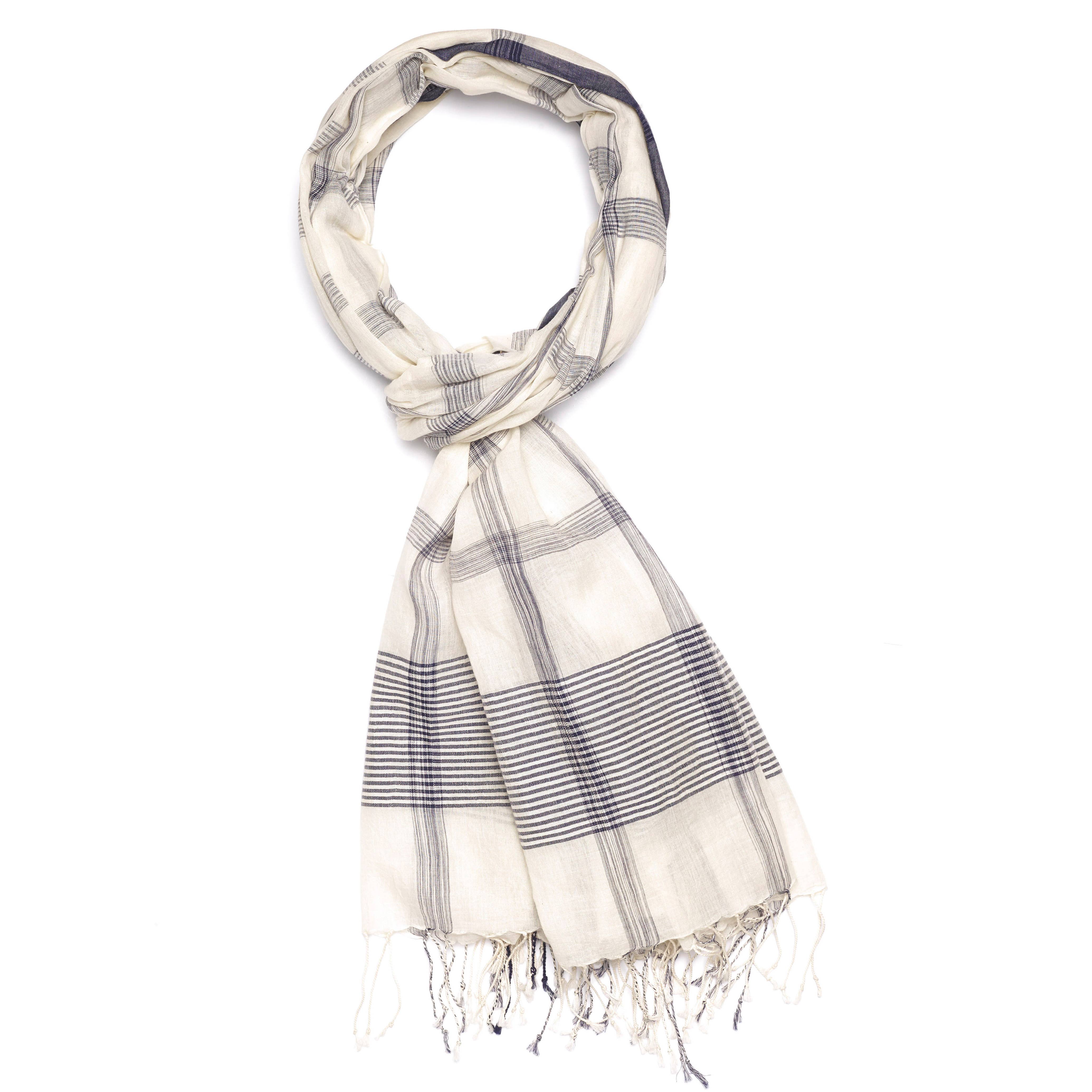 This handwoven scarf is one of our best-sellers. Comprised of soft cotton with jacquard edges in a floral vine motif and matching varied stripes on the ends. This rich charcoal grey is complimented by silver on the edges and ends. Available in Navy, Charcoal and Sea Content: 90% Cotton, 10% Zari. Dimensions: 71" x 28"