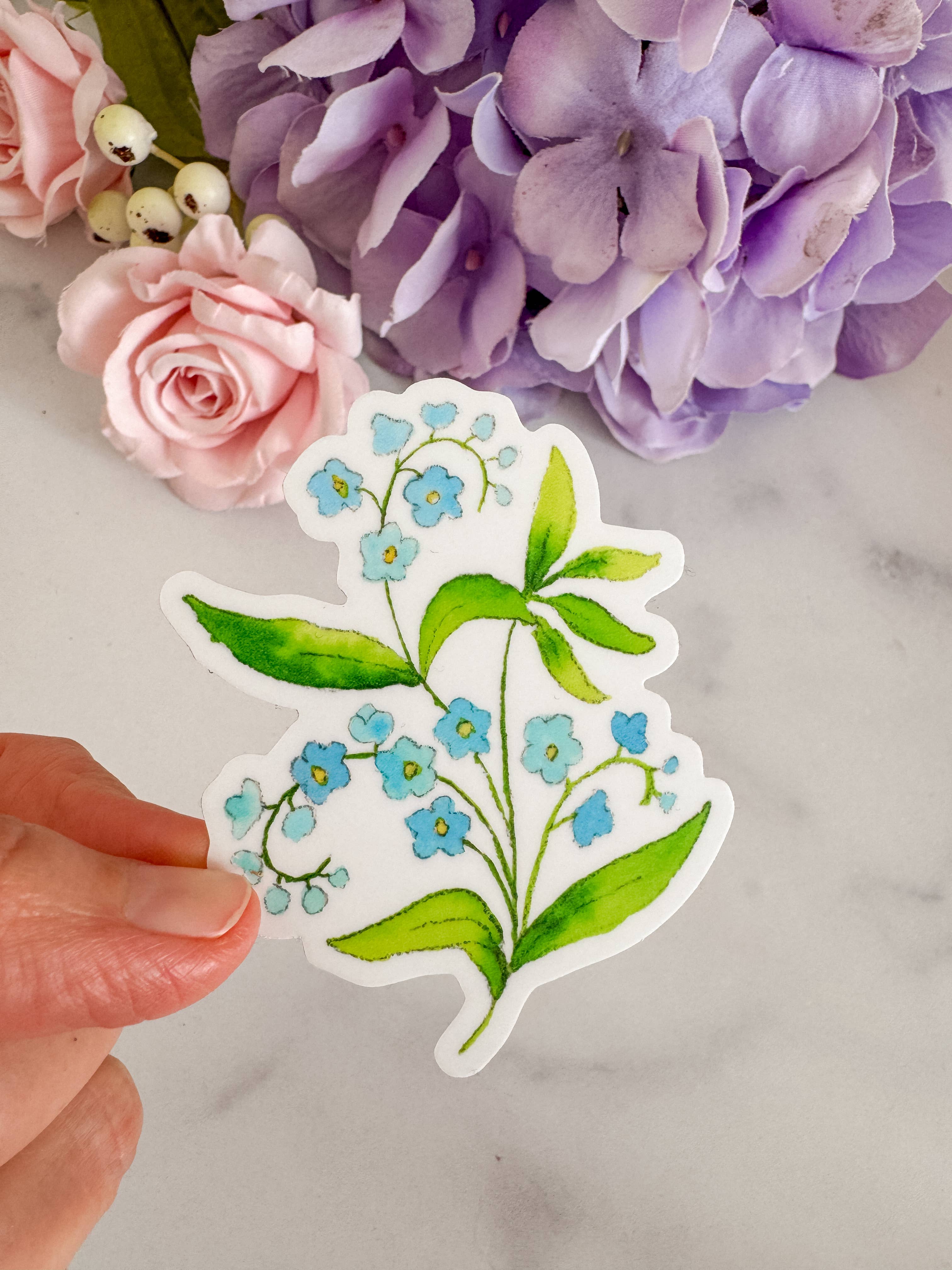 Sticker of an original watercolor painting of soft blue forget me not flowers. • Vinyl • Waterproof Have fun with these stickers and place on waterbottles, notebooks, laptops, etc.