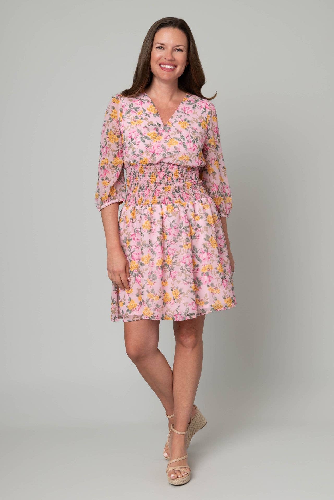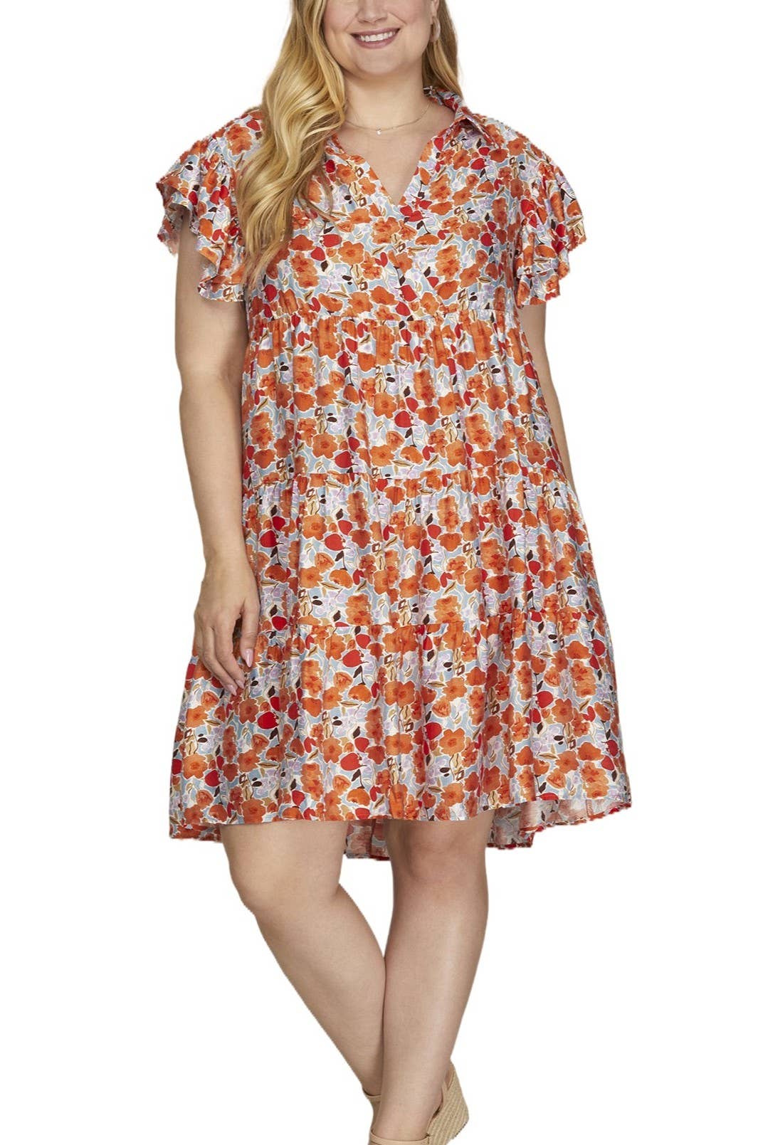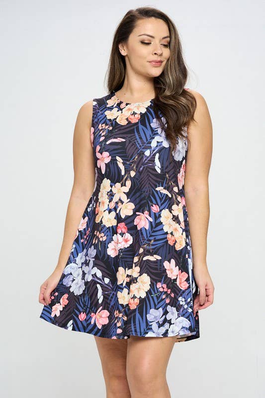 PLUS SIZE FLORAL PRINT SMOCKED FLARE DRESS. 100% RAYON.