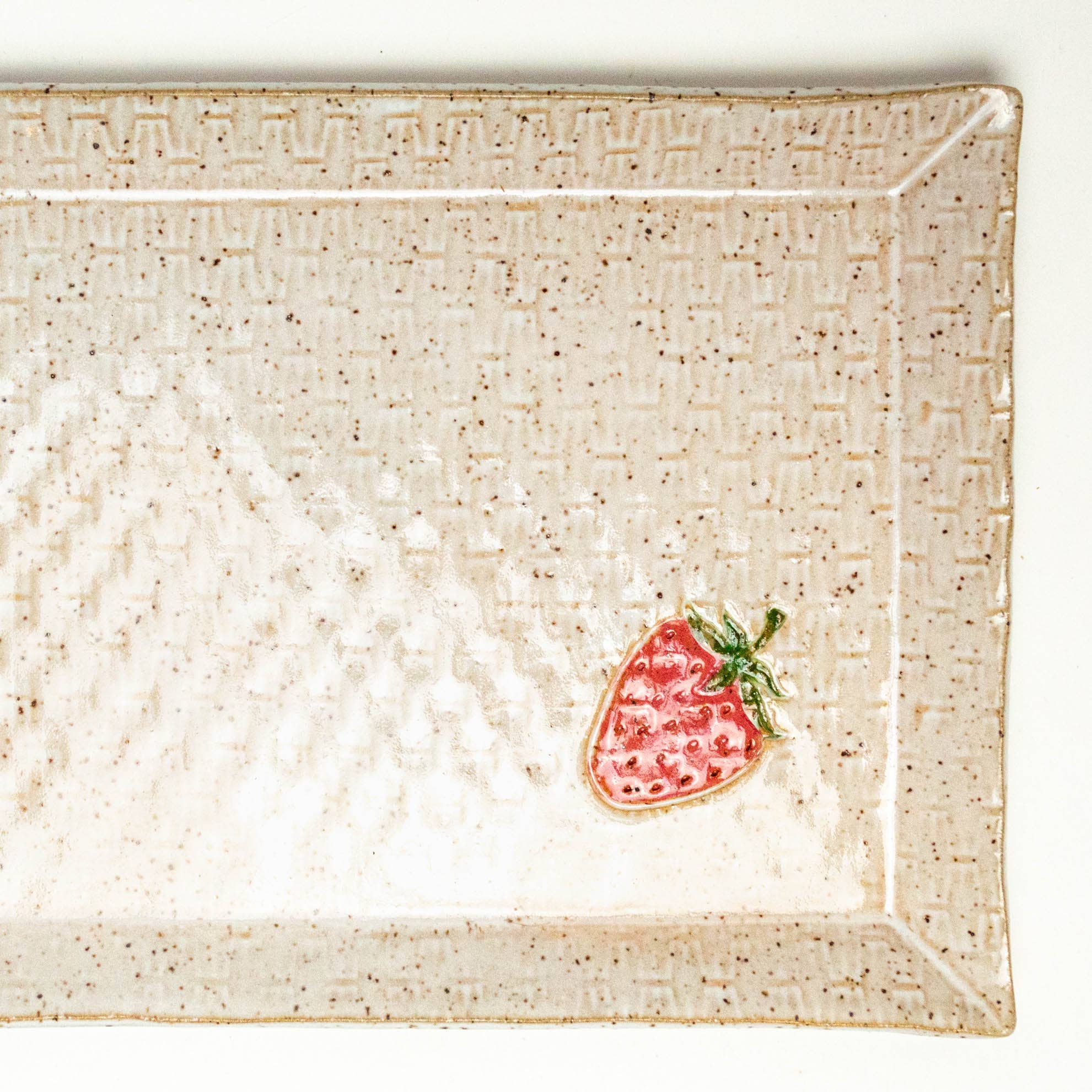 This beautiful strawberry pattern mug, approximately 10 oz., is hand-built and hand-glazed in Oberlin, OH, USA. Food, dishwasher, and microwave safe. It measures approximately 4 inches long by 3 1/4 inches wide and 3 1/4 inches high. All our ceramic items are handmade and will vary from one to the next. No 2 pieces will be exactly the same. Colors may vary slightly.