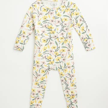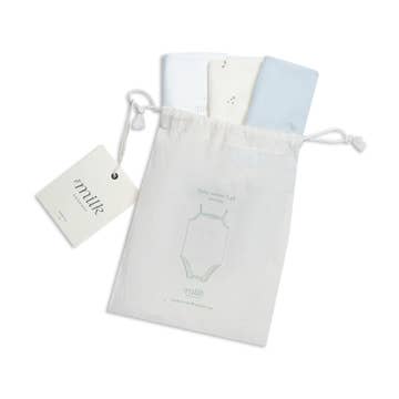 The bodysuit that combines softest baby blue tones with the tiniest hand sketched sprigs, featuring silken smooth organic cotton and ivory covered snaps. Sold as a 3 pack in a darling organic cotton pouch.