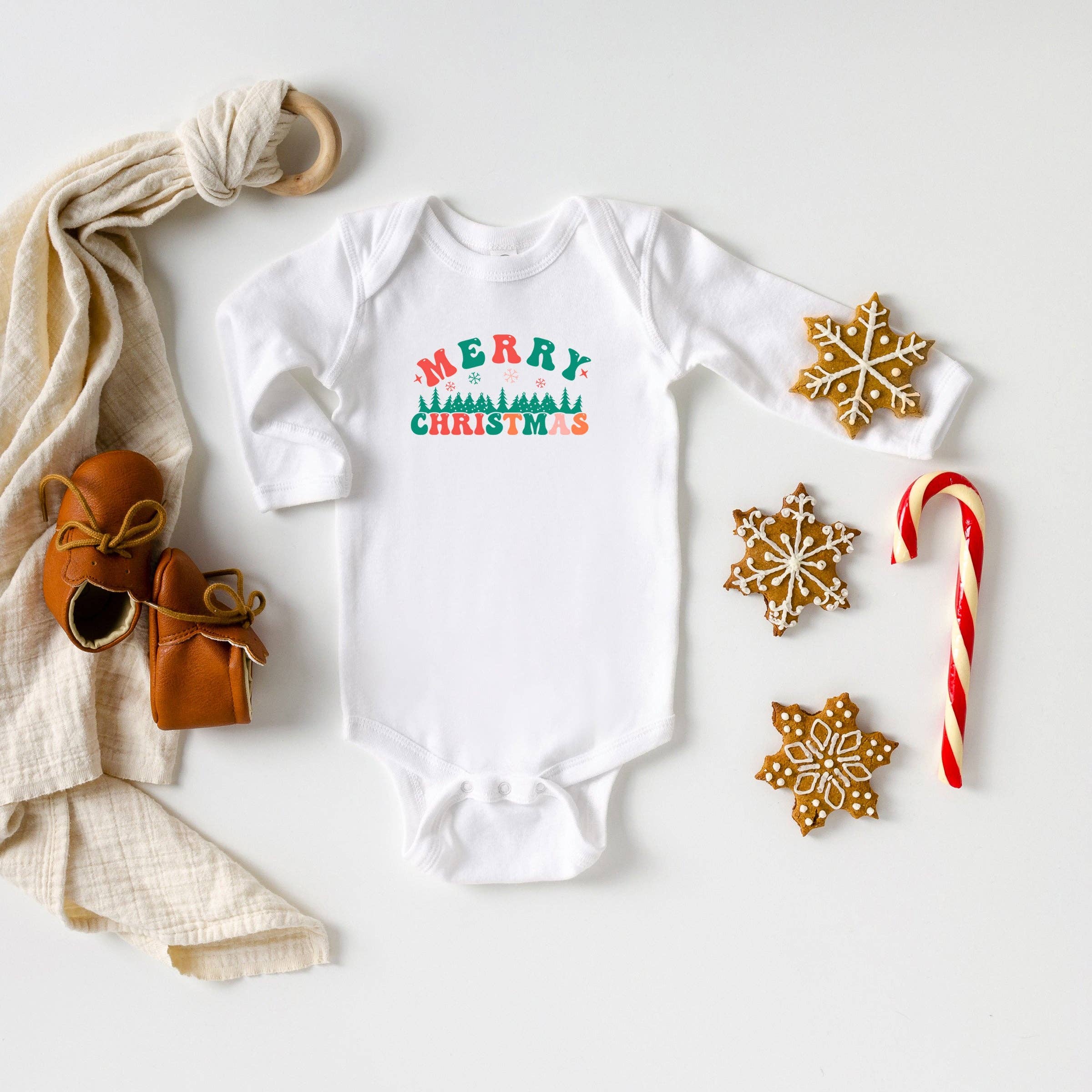 The perfect long-sleeve snapshirt to celebrate baby's first Christmas in. 0-3 month size features foldover cuffs on wrists to keep little hands warm. • Material: 95% Cotton, 5% Spandex • Care Instructions: Machine Wash Cold. Tumble Dry Low.