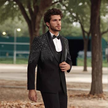 Our claim to fame, these unique printed blazers will be the topic of conversation at any dinner party. Like our name suggests, Bespoke committed to offering apparel that may as well be tailor made just for you. The Modern Fit is a hybrid between Slim and Classic Fit. With many prints and textures to choose from, you get to choose the style that suits your every need. Product Details Modern notch lapels Satin lining Non-functioning button cuffs Interior passport pockets Fitted Color: Black Materials: 97% Polyester, 3% Lycra Dry Clean Only