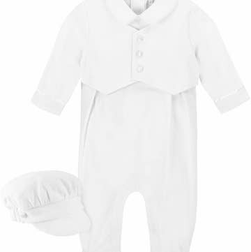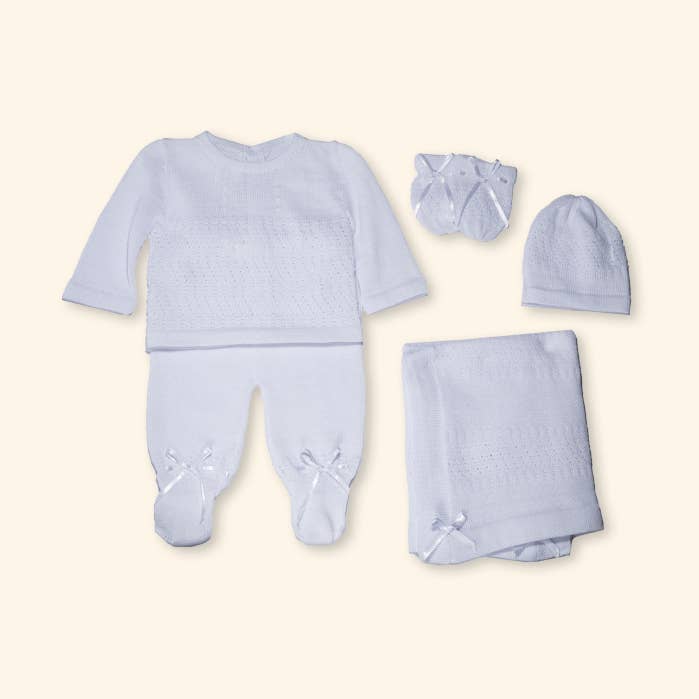 Knitted with blue details. Your newborn will look like a lovely cloud. Matching socks, mittens and cap. Available in White or Ivory Ref. 2558W, 2558I
