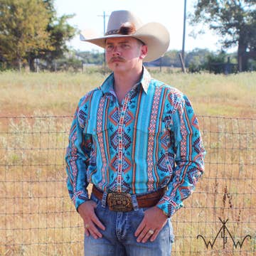 Fit true to size Turquoise and orange with orange pearl snaps 2 front pockets Longer tail length to help stay tucked in with movement Curved bottom hem for wearing tucked in or untucked Gentle wash- DO NOT DRY- Hang Dry or Dry Clean/Starch 100% Cotton