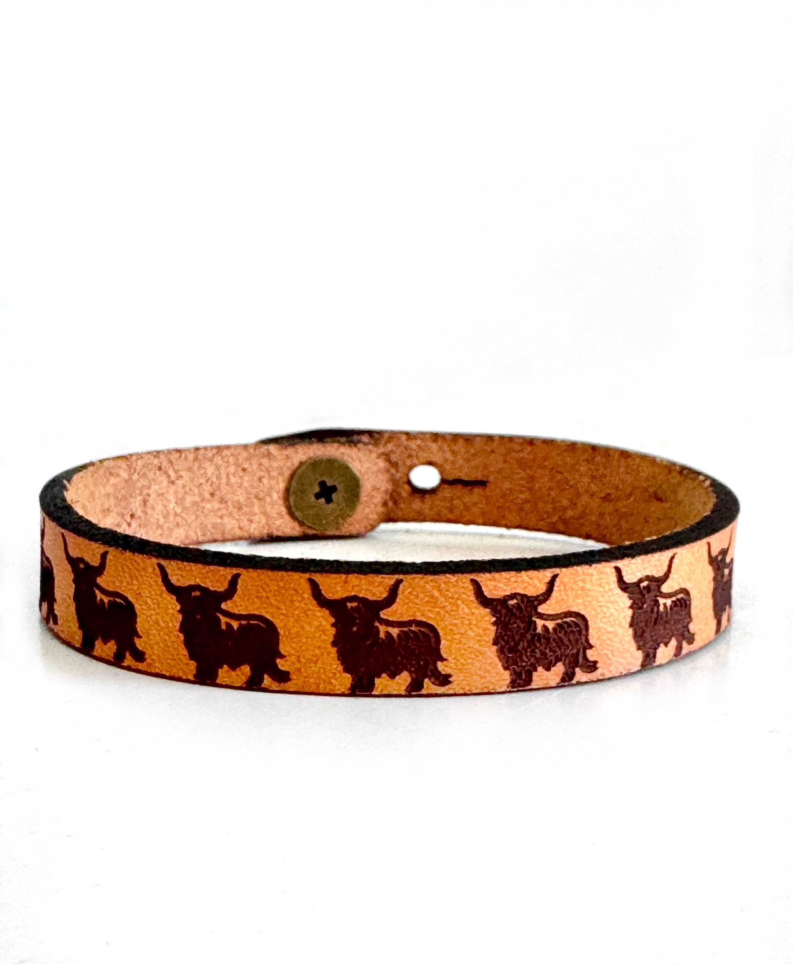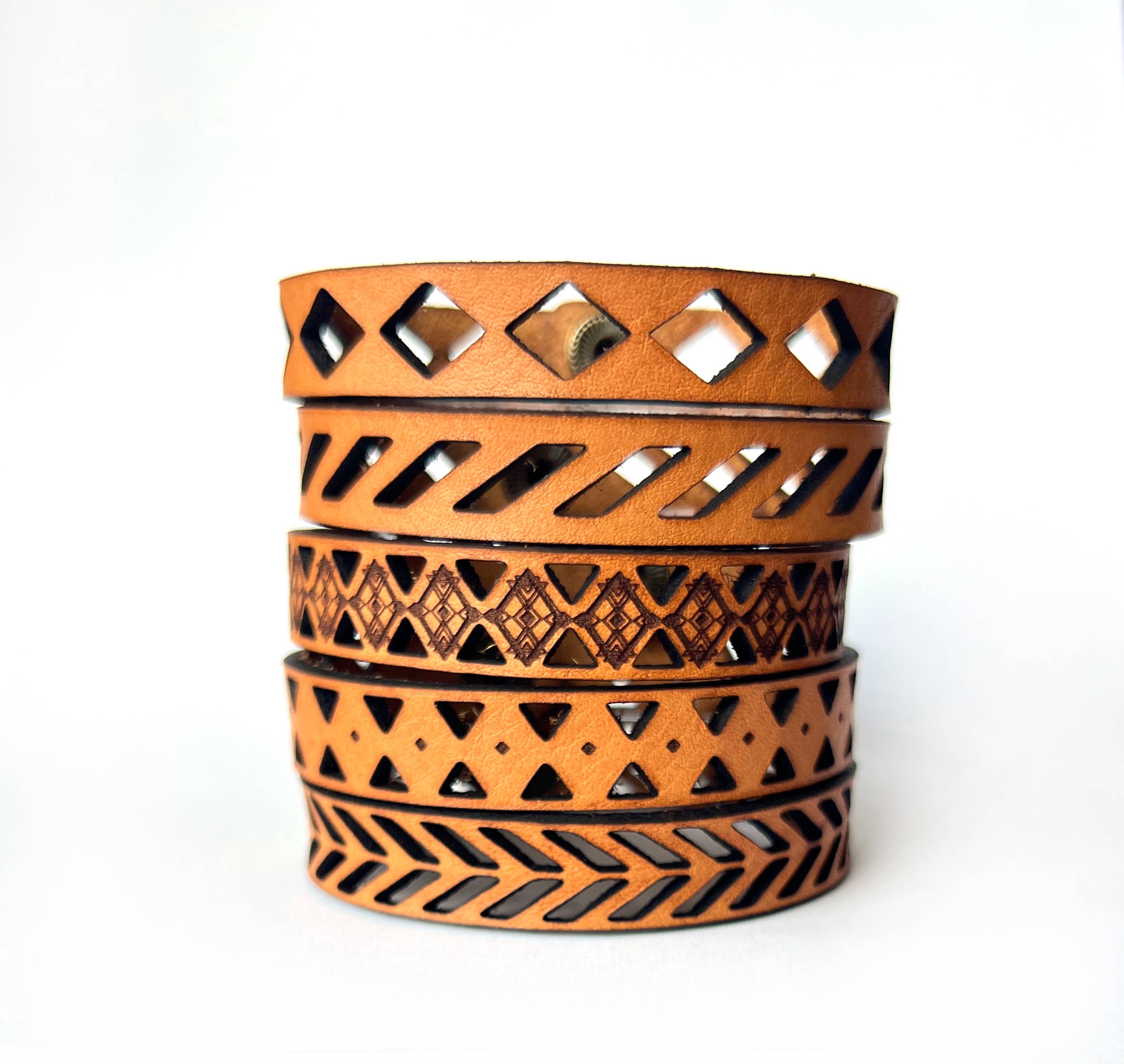 Western Boho Engraved Leather Bracelet Choose Specific Design 1/2” wide 8 1/2" size. (can be customized) Brass Snap closure This bracelet cuff is made from premium, full grain leather from our local leather shop. We hand select each hide for quality. Your bracelet is then laser cut, engraved by us, and finished with solid brass snap for a long lasting touch. It's comfortable and lightweight, making it great for everyday wear. Each piece of leather is different, please allow for slight differences in appearance, making each one unique.