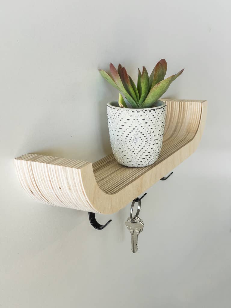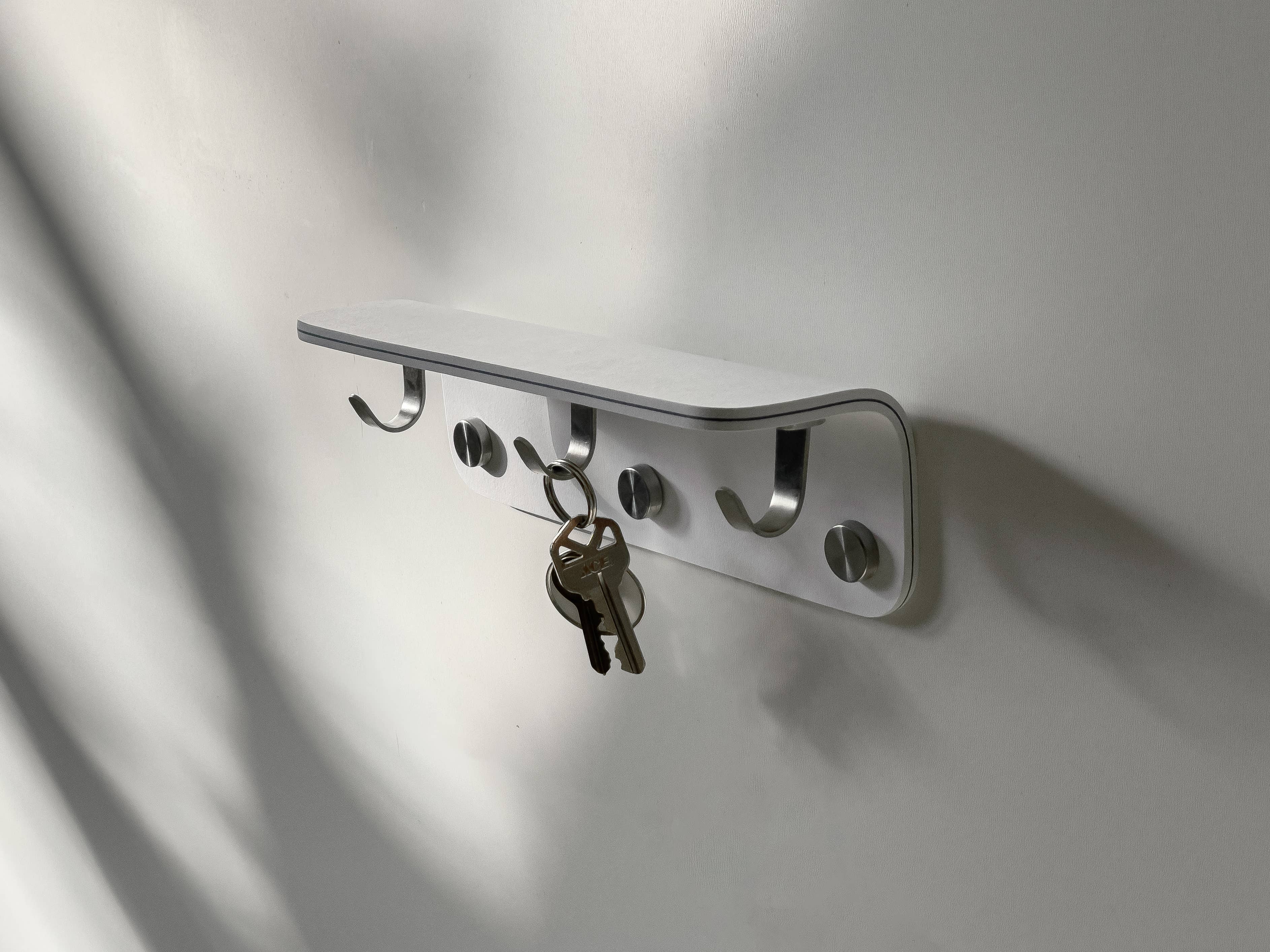 Product Details: - Materials: Paper + Steel Hooks & Screws - Dimensions: 8" x 2.7” x 2.7” - Weight Capacity: 35 lbs - Art Options: Fully Customizable or choose one of our in-stock options - Production Time: 1 week - Returns & Exchanges: If you're not completely satisfied, returns are accepted within 30 days. Paper Collection: Modern wall-mounted entryway shelf handcrafted from formed paper, designed for hanging keys, purses, coats, and everyday essentials. This organizer blends functionality with minimalist style, making it perfect for apartments, mudrooms, or small spaces. Its sculptural design doubles as wall decor, offering a unique storage solution for busy households. An eco-friendly gift for housewarmings or anyone who loves functional modern design. Customizing: Our formed paper material can be printed on. Email us at abrown@bespokeobjects.com and attach your custom artwork. Orders of QTY's above 30 or more, we offer Riso, Archival Giclee, Offset, or Screen Printing.