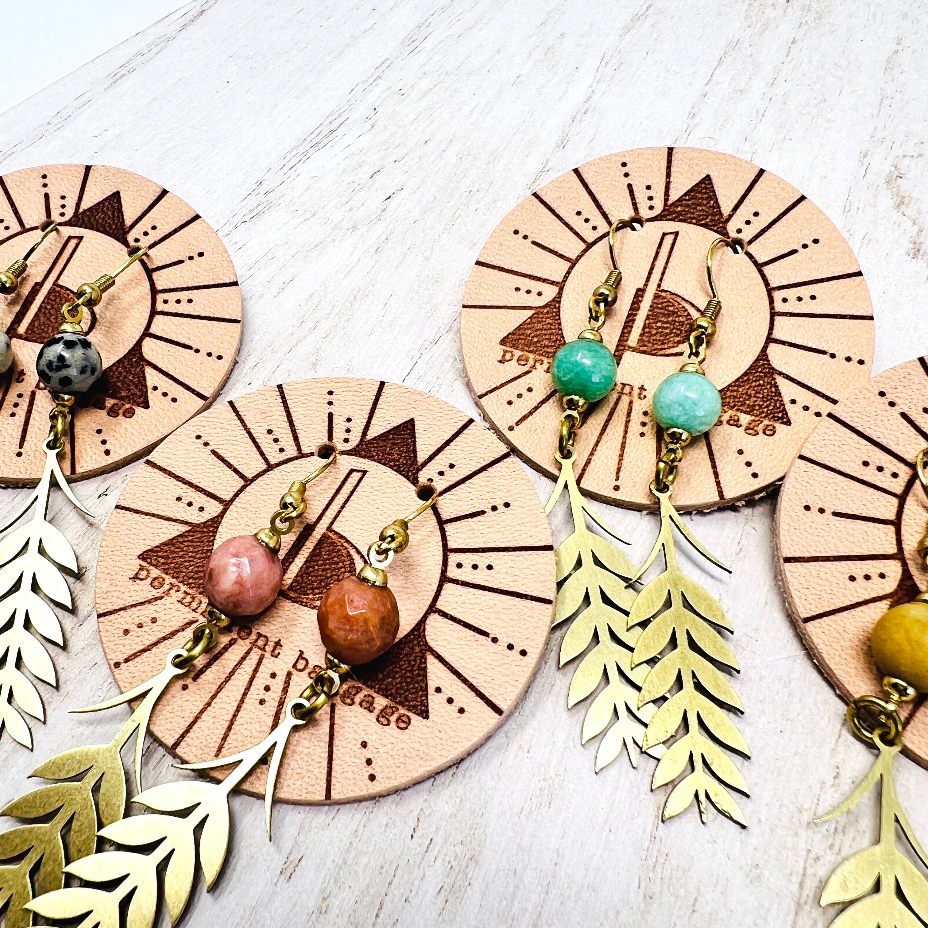 This pair of brass post earrings features a .75" brass hoop with your selection of, 10 mm round, semi-precious gemstone balls. Gemstones are flanked by 2 solid brass beads. Post earring is a 3/8" hammer textured disk that has been waxed to slow tarnish. Ear post in surgical steel and nickel free. Ten gemstones options to select from or shop "Assorted" for an awesome easy mix and a little extra savings per item!
