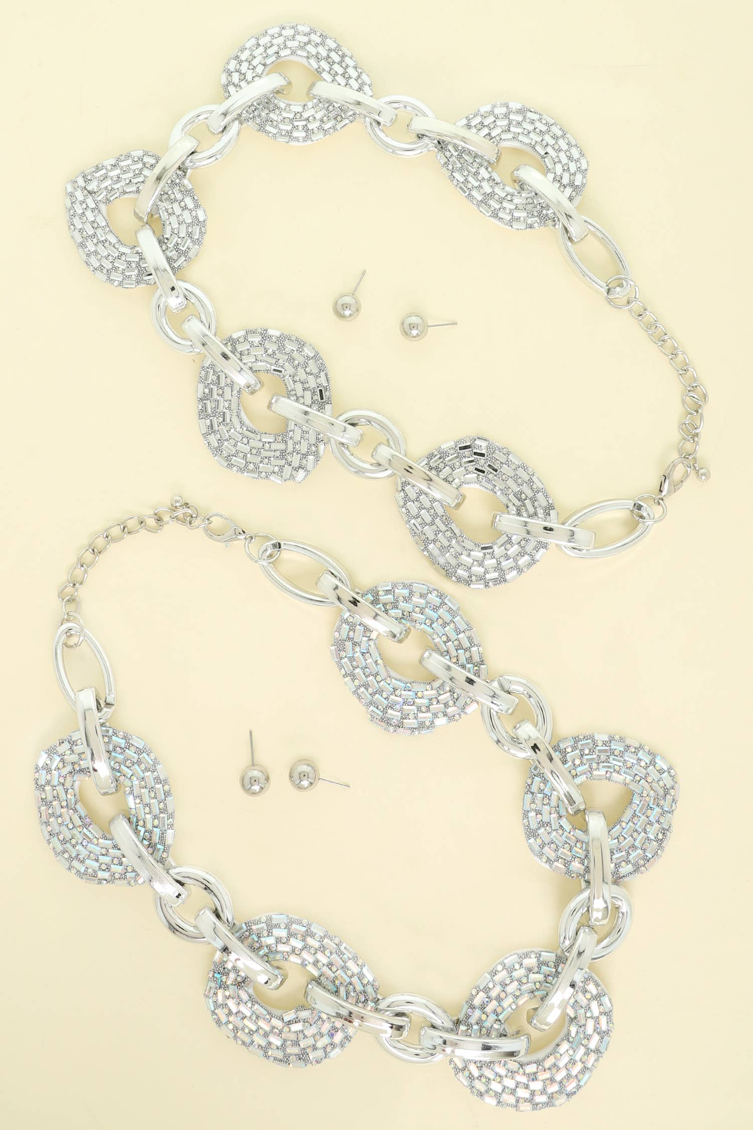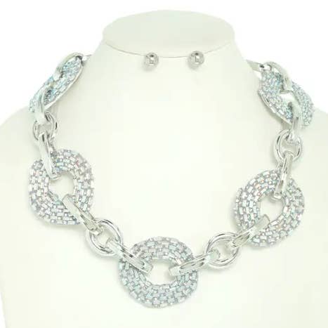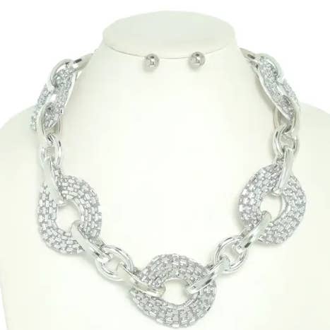 This Fashion Chunky Chain Link Necklace Earring Set offers a bold and stylish accessory to elevate any outfit. Crafted with high-quality materials, the set boasts a modern and versatile design that effortlessly adds a touch of glamour to any ensemble. Enjoy the perfect blend of fashion and functionality with this must-have accessory set. LENGTH: 19" EXTENSION: 3" DROP: 0.50" EARRINGS: 2.5"