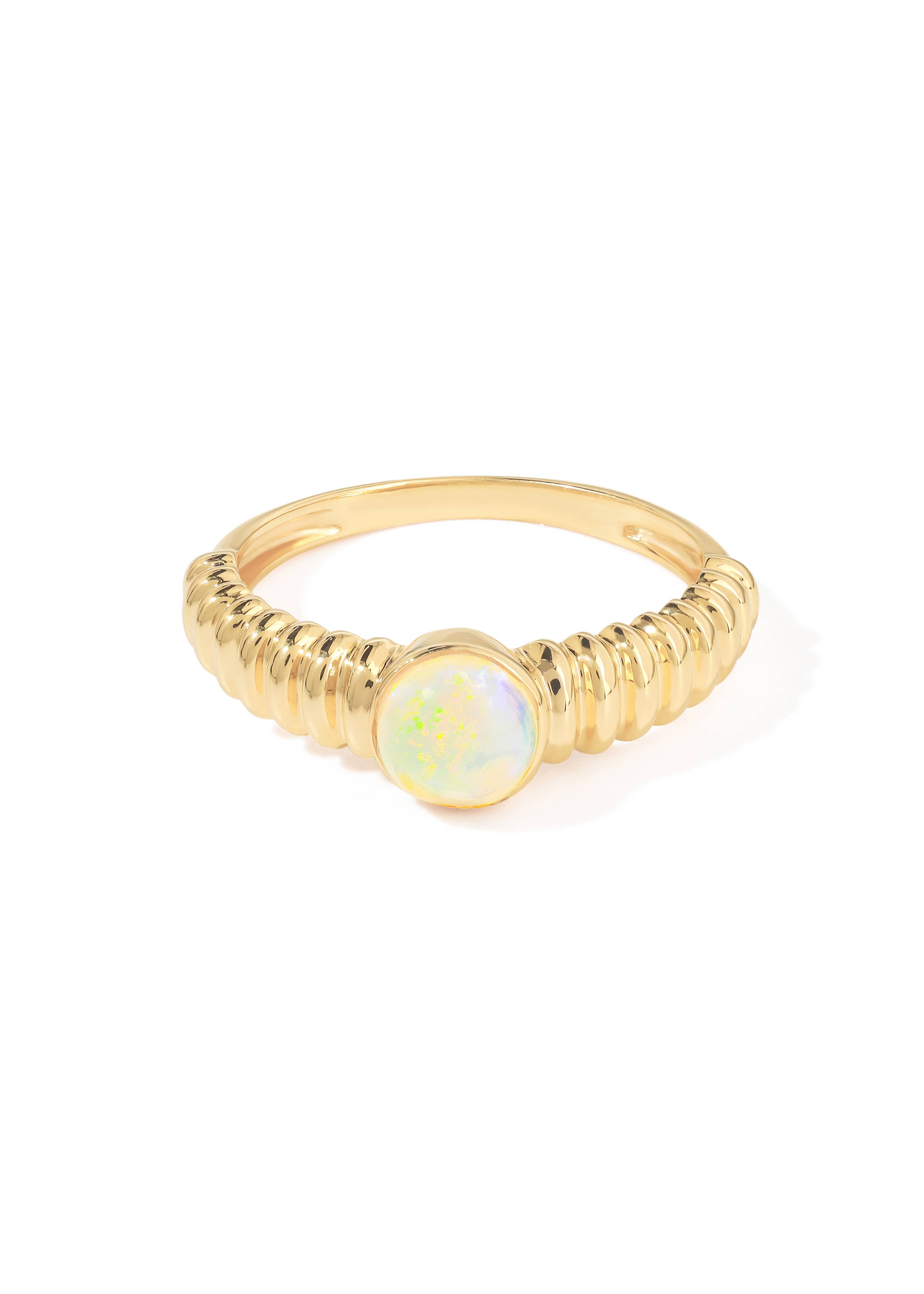 A halo of freshwater rice pearls encircle the rough green garnet embedded in brass to make this sweet motif on our signature textured band. The perennial collection is inspired from continually recurring ideas and motifs. Art, history, people and even plant life tend to repeat themselves; but the interest lies in what and how we build on top of these ideas. What are the parts we take with us, the parts we leave behind, and the parts we create and recreate. Will the perennial power of art and poetry help us spiral inwards, outwards or even in a continuous circle. 3/4" Sizes 5-9
