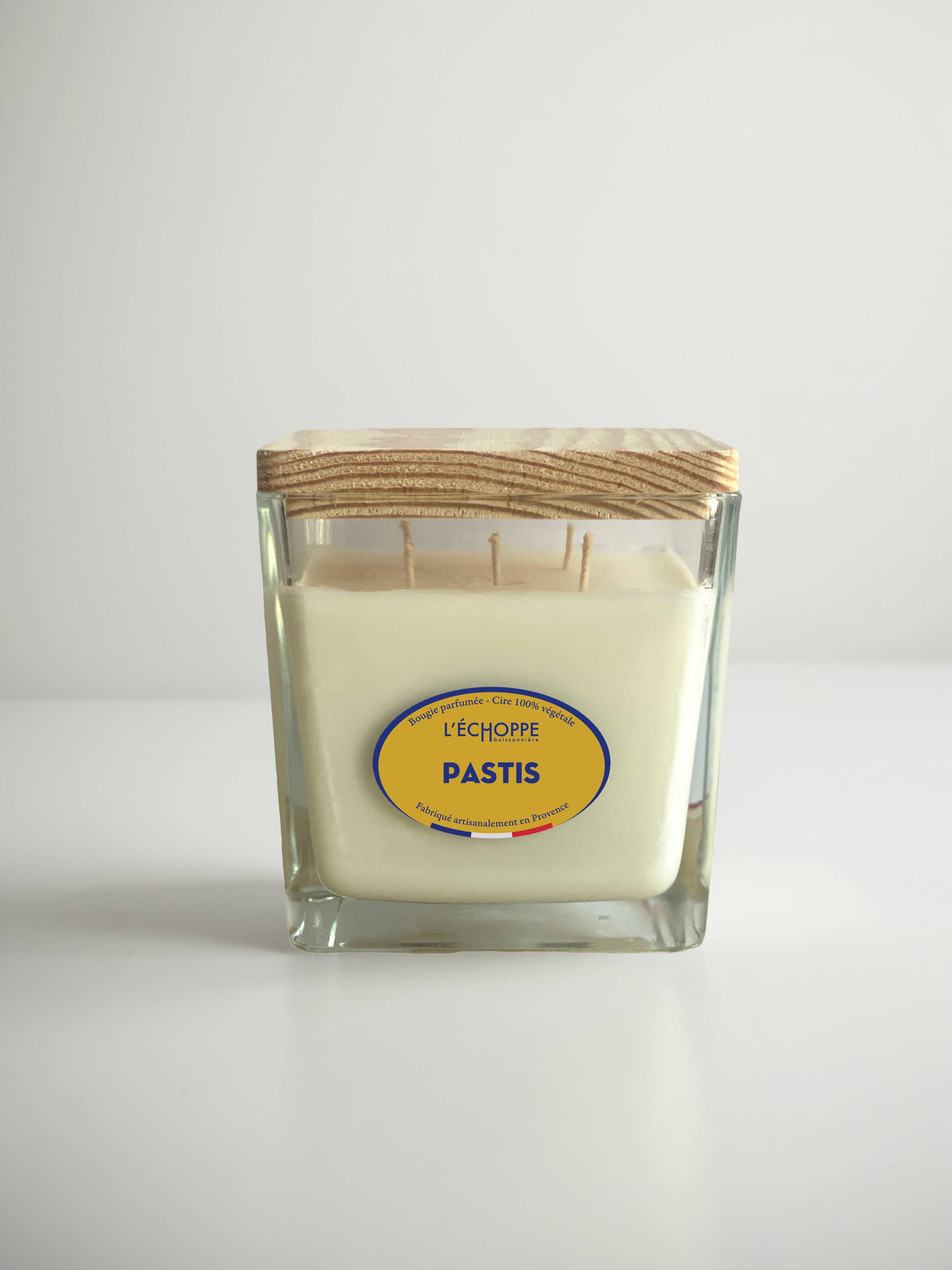 SQUARE GLASS JAR Wooden lid made in E.S.A.T. Scented candle 100% vegetable soy wax Cotton wick Burn time 50 h Net Weight: 190g Grasse fragrance Made in France