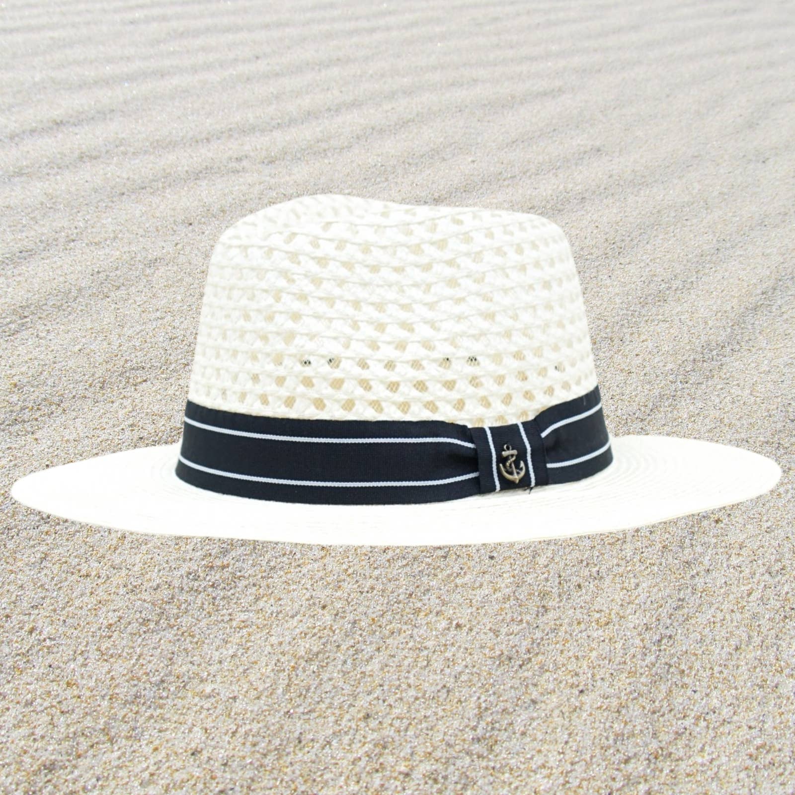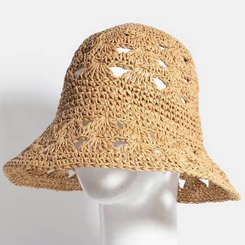 Hand crocheted raffia straw bucket hat with peekaboo weave pattern. Handmade from organic raffia straw Adjustable size with inner hidden velcro drawstring Comfortable inner sweatband Packable Brim: 3 in.