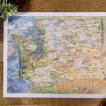 The mountain peaks and attractions of the cascade range, spanning from Washington to Oregon to California, illustrated and painted in a bright watercolor palette. Each art print is printed on 11 x 17 inch 110lb archival-quality matte paper and comes unframed. Original, hand-painted design by watercolor artist Amy Wike.
