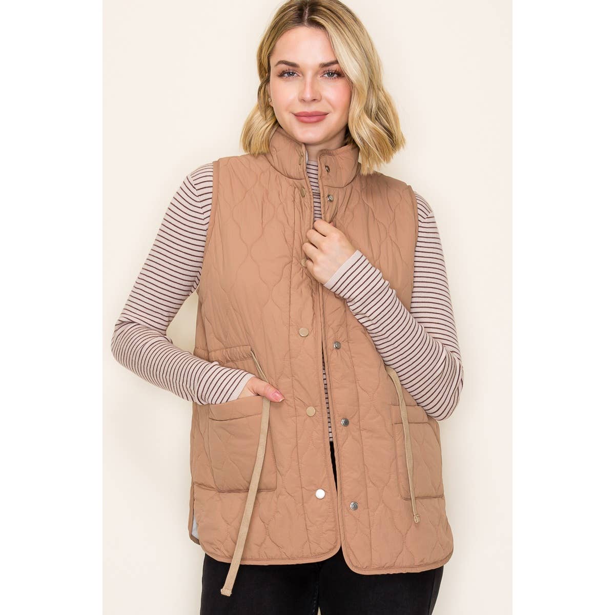 ***Image usage is allowed to the buyers who purchase from us via Faire only. SI-24743 SLIM FIT SUEDE PIPING QUILTED PADDING VEST Fabric Content: 100% POLYESTER BrandBestseller SI-24743 Slim Fit Suede Piping Quilted Padding Vest (100% POLYESTER) BLK-black-155345 IVY-ivory-155348 NVY-navy-155350 WHT-white-156663 PNK-beige pink-170154 KHA-caramel-170155 TPE-pale taupe-170156 OLV-olive oil-170157 BRG-dark wine-170158 BRN-hazelnut-185552 RED-red-185553
