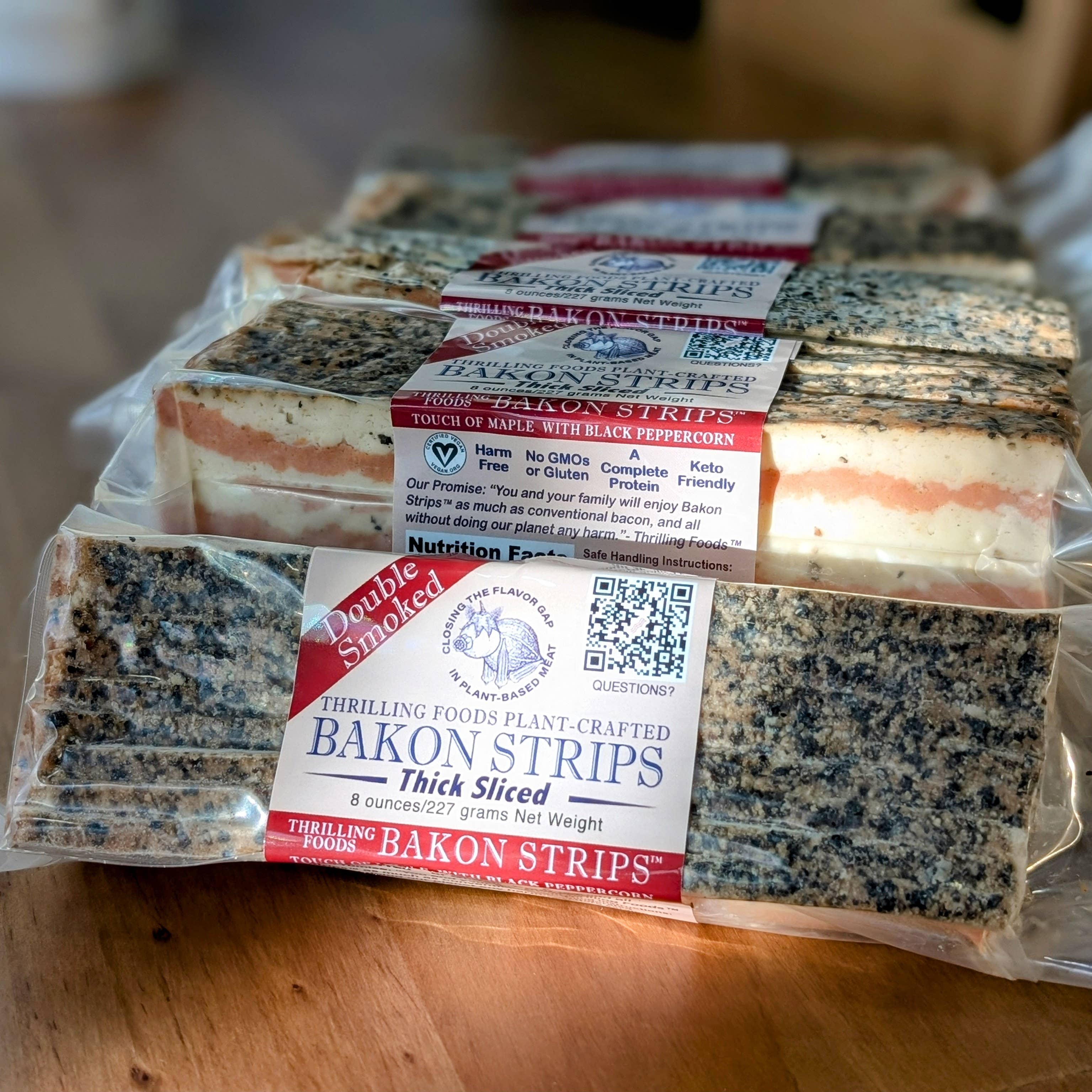 Stock your store with the plant-based bacon that's revolutionizing the category. Thrilling Bakon™ has quickly become the top choice for serious bacon lovers - not just vegans. In fact, over 70% of our repeat customers are omnivores who choose Bakon™ for its authentic, smoky flavor and satisfying crispy texture. Our 6lb case format, containing 12 retail-ready 8oz packages, ensures efficient inventory management while delivering the meaty, savory taste your customers crave. The "plant-based" category as a whole has slowed down, but not us: Thrilling Bakon™ continues to gain momentum. In a field of mediocrity or worse, Thrilling Bakon™It stands out as a premium alternative that truly satisfies both traditional bacon enthusiasts and plant-based consumers, driving category growth and repeat purchases.