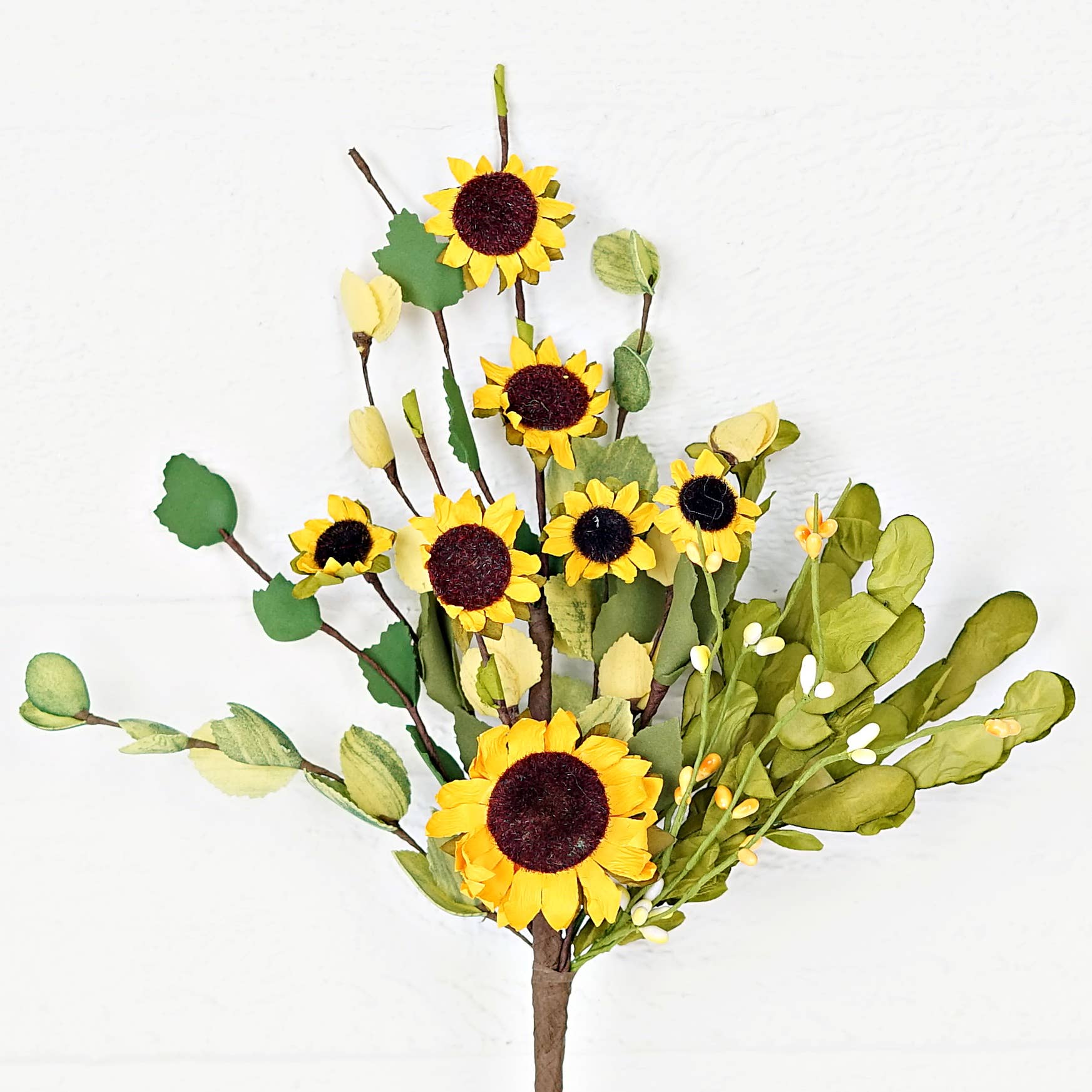 Giant sunflowers will brighten anyone's day. The Sunflower has 4 heads ranging in size from 4.5 inches to 7 inches in diameter. In addition, there is a 2-inch Bud. Surrounding the sunflowers are 7 large realistic leaves.