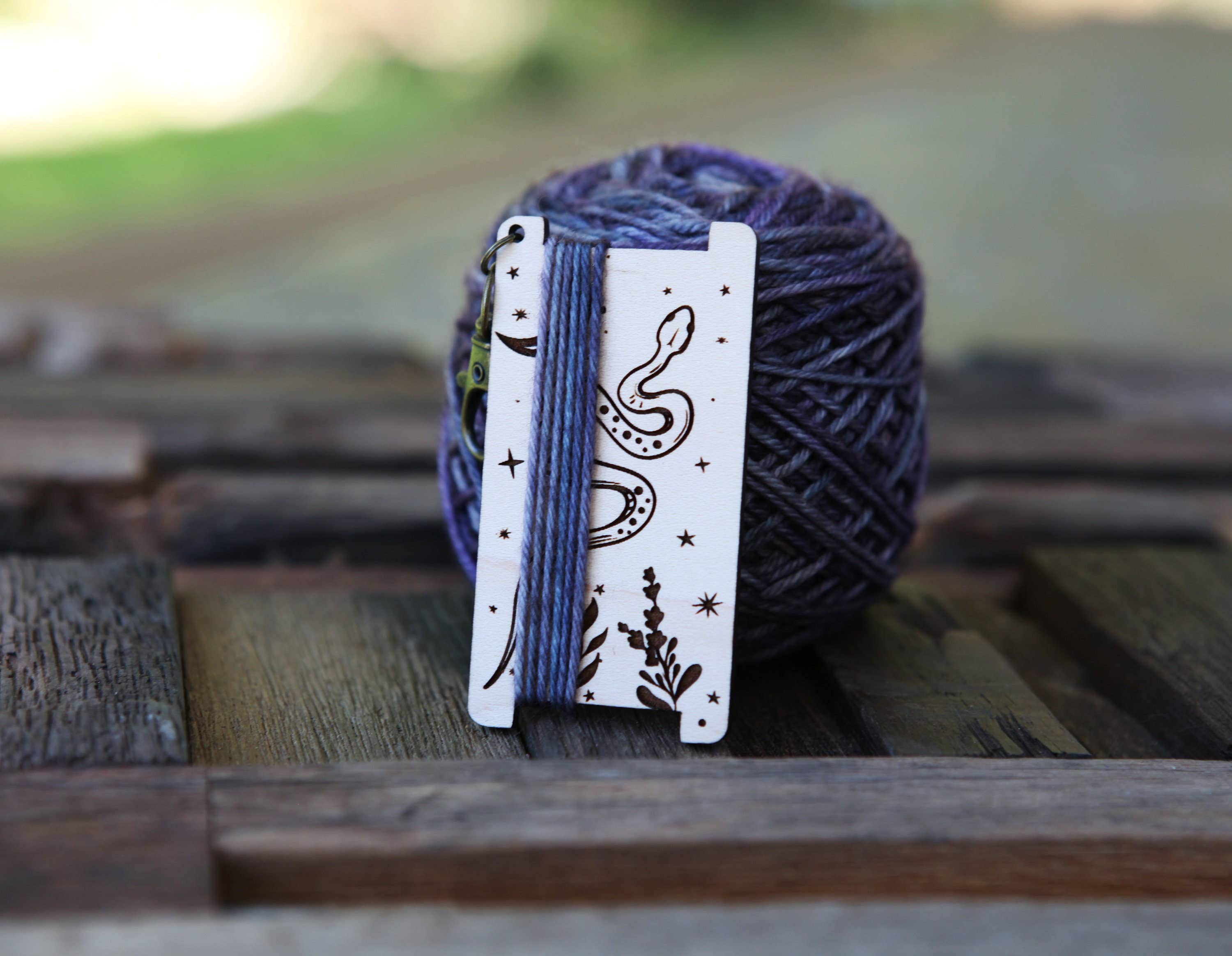 Crystals And Leaves Bound To A Yarn Hank With Stars Spinners Control Tool, Wpi (Wraps Per Inch) Ruler Made From Cherry Wood For Yarn Gauge Crystals and leaves are bound to a yarn hank spinner control tool, with stars floating above. This WPI (Wraps per Inch) Ruler is made from cherry wood and is used to identify the gauge of a yarn. This is great for any who loves yarn skeins and crystals. Wraps per inch (WPI) is a way to measure the thickness of a yarn. This tool is used by spinners but is also helpful for knitters and crocheters to determine the weight of the yarn and what the approximate gauge will be. This guide also has lines on the back to measure your yarn against, including lace, fingering, sport, DK, worsted, bulky, and super bulky. This yarn guide measures about 3 inches tall by 1.5 inches wide and comes with a brass clasp to hang on your knitting bag. Since each piece of wood is unique, the item you receive may be slightly different from the photos.