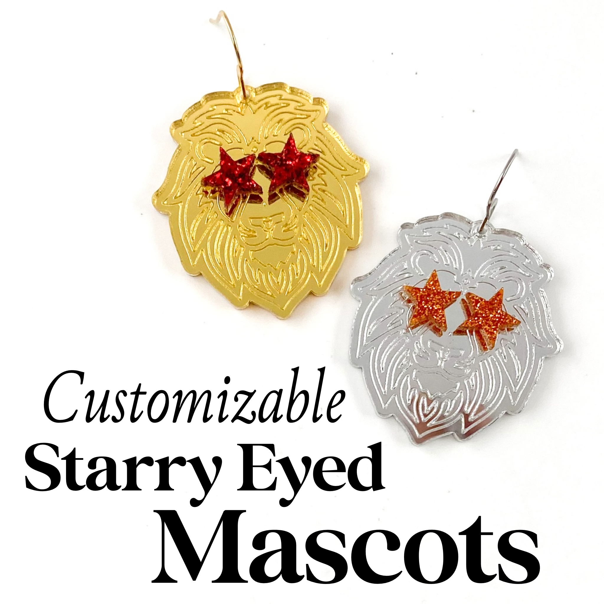 Unleash your team spirit with our 2" Fan Glam Mascot Dangles! These custom earrings feature an engraved mascot design and customizable glitter stars. Available in gold or silver mirror, they're the perfect accessory for showing off your school pride. Go team! Dimensions: 2" x 1.5" Settings Type: Hypoallergenic & Stainless Steel** All settings are lead and nickel free** Materials: Acrylic Ship Time: Please allow up to 10 business days to ship! Lightweight Our earrings are HANDMADE by us in our shop in North Texas! Please, feel free to use our pictures! We do not recommend wearing our product in water!