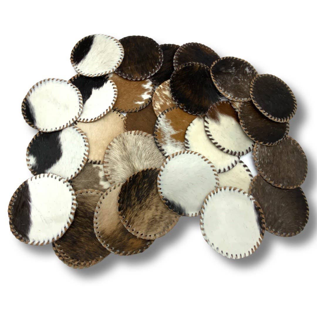 Give your table a cozy, rustic vibe with this Horseshoe Cowhide Coaster Set. Made from authentic cowhide, each piece boasts its own unique pattern—making every set truly one of a kind! Sized just right and sold in sets of four, these coasters guard your surfaces and invite a bit of fun to your gatherings. Let a little wildness into your daily routine! Horseshoe Cowhide Coaster Set Details: Measures 4.3 inches Set of 4 Made with genuine Cowhide so no two alike