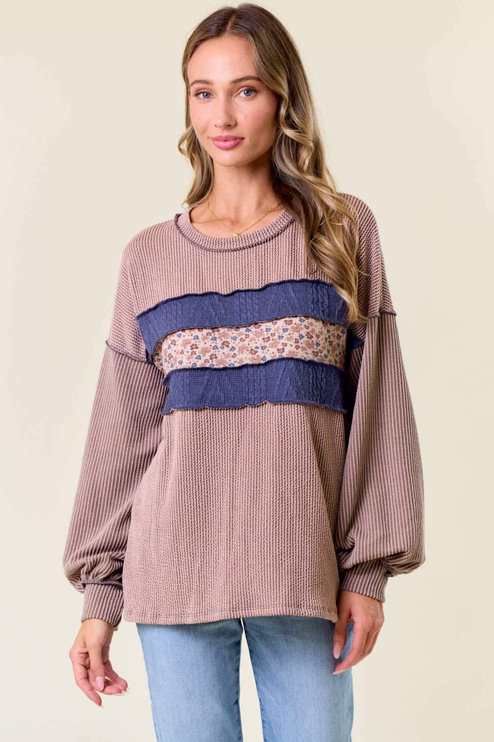 Wholesale W1106 | Sweater Knit Crochet Round Neck Long Sleeve Top