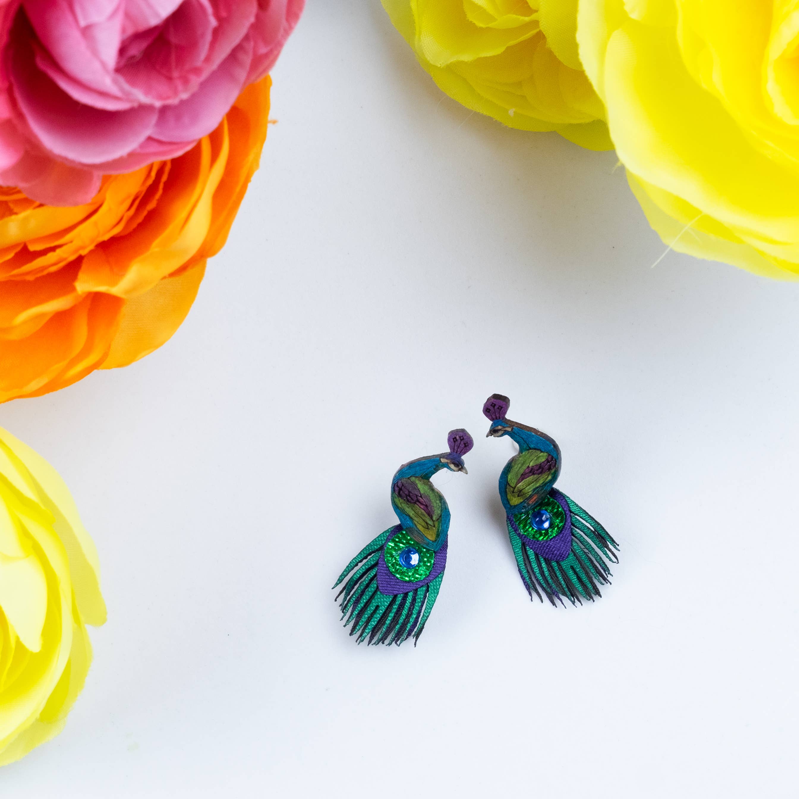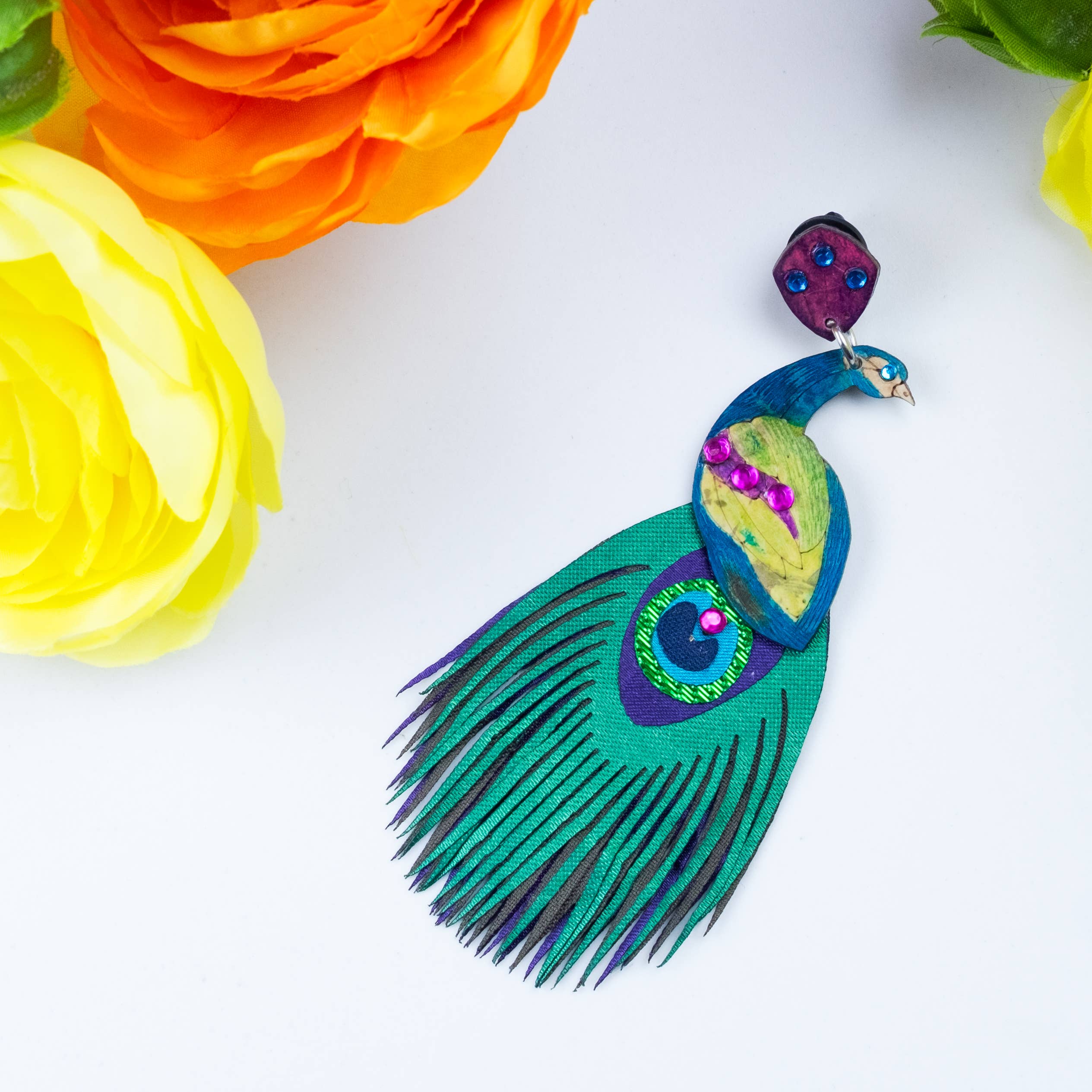Earrings handmade in Colombia of painted gourd and laser-cut fabrics. Designed and crafted by Indigenous Mokaná, Afro-Colombians, and mother heads of households in Northern Colombia. Proud member of the Fair Trade Federation & Chicago Fair Trade. Posts are 316 grade Stainless Steel.