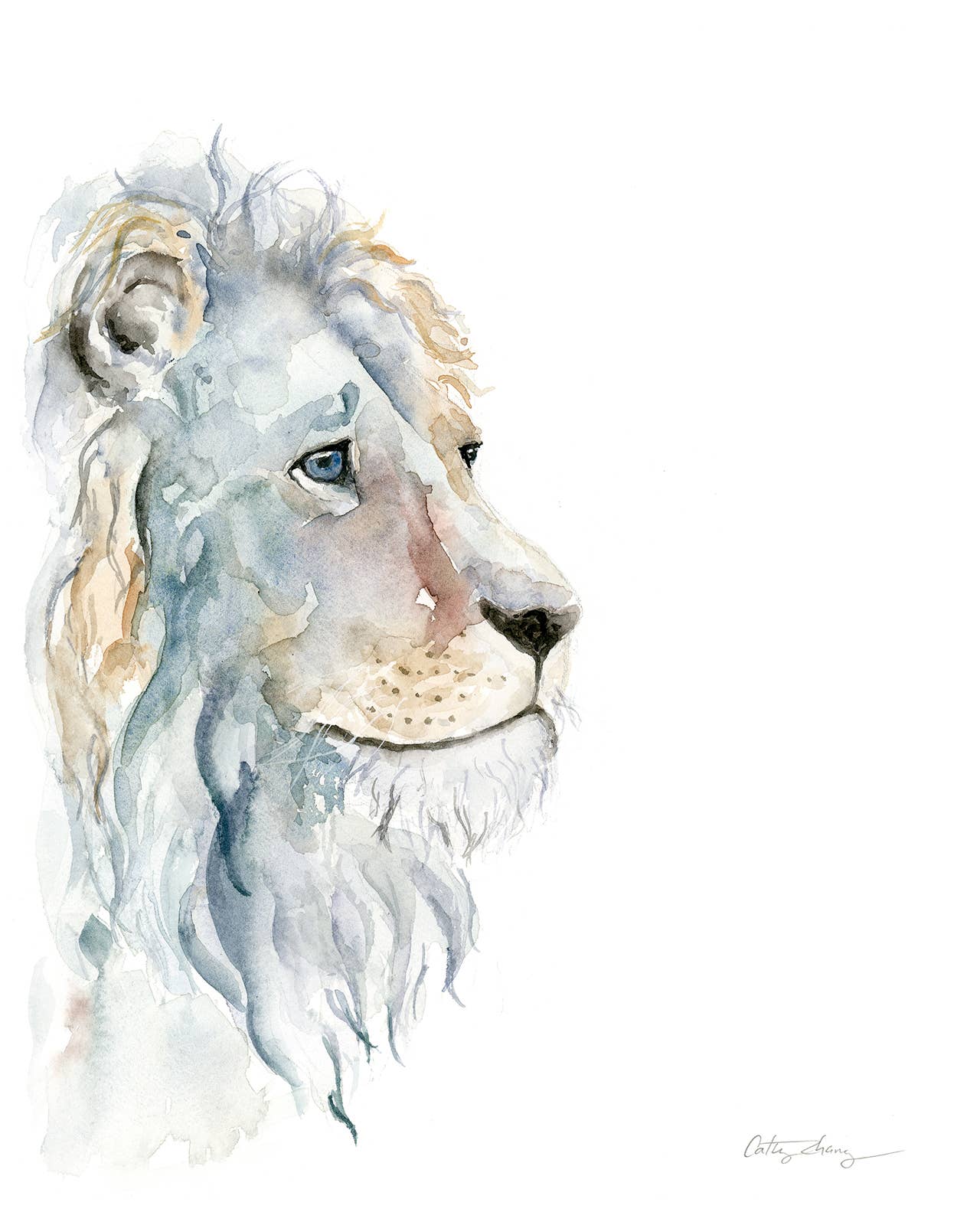 Lion art print reproduced from original watercolor. Material - bright white ultra premium matte paper. Packaging - clear cello sleeve, backing board, mini business card.