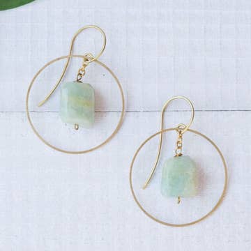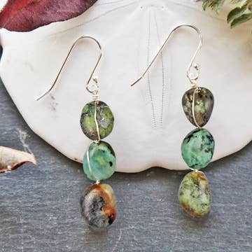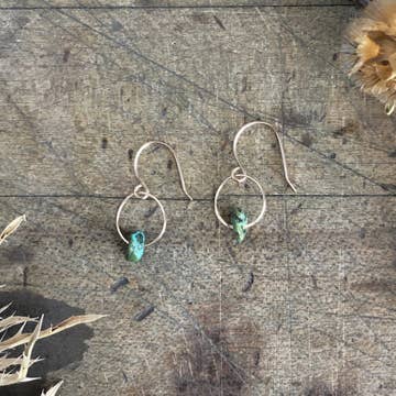 These birthstone earrings are simple, special and sweet. Rough cut turquoise gemstones dangle from a lightly hammered jump ring on handmade earring wires. Turquoise is the birthstone for December and symbolizes health, healing and renewal. Length 3/4" Width 1/4" This piece is handmade-to-order. Each piece will vary slightly due to the uniqueness of the stones. All metal is nickel free.
