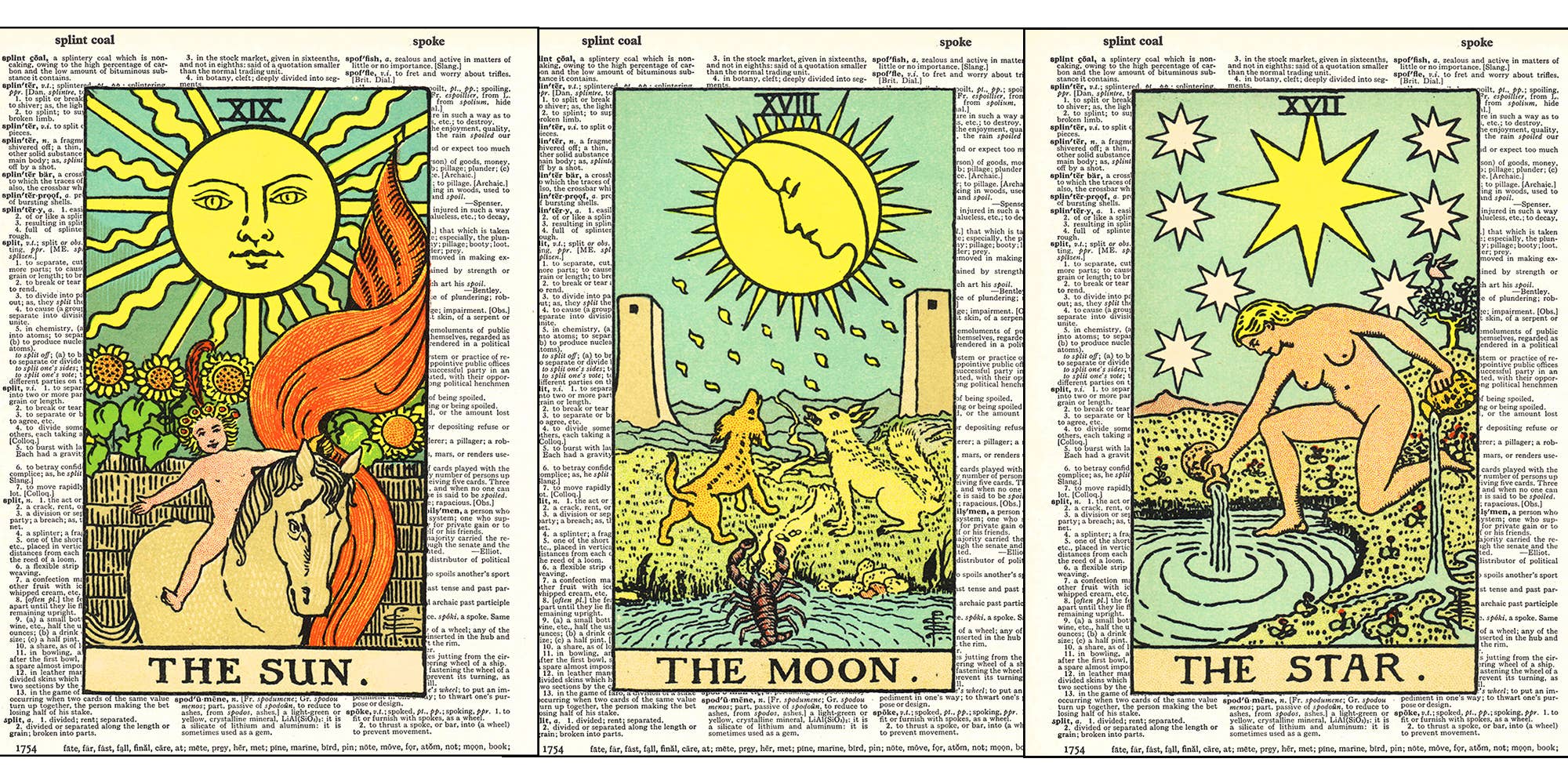 This is a sample of 3 Tarot-themed Dictionary Art Prints. Dictionary Art Print measures approx 8" x 10.5". Frame not included, printed on authentic vintage dictionary page, perfect for an 8 x 10 frame or a standard 11 x 14 mat with an opening for an 8 x 10 print, frame is not included. Each page has a natural patina that will be different from book to book. Each print is packaged in a clear cello bag with a chipboard back and a seal of authenticity.