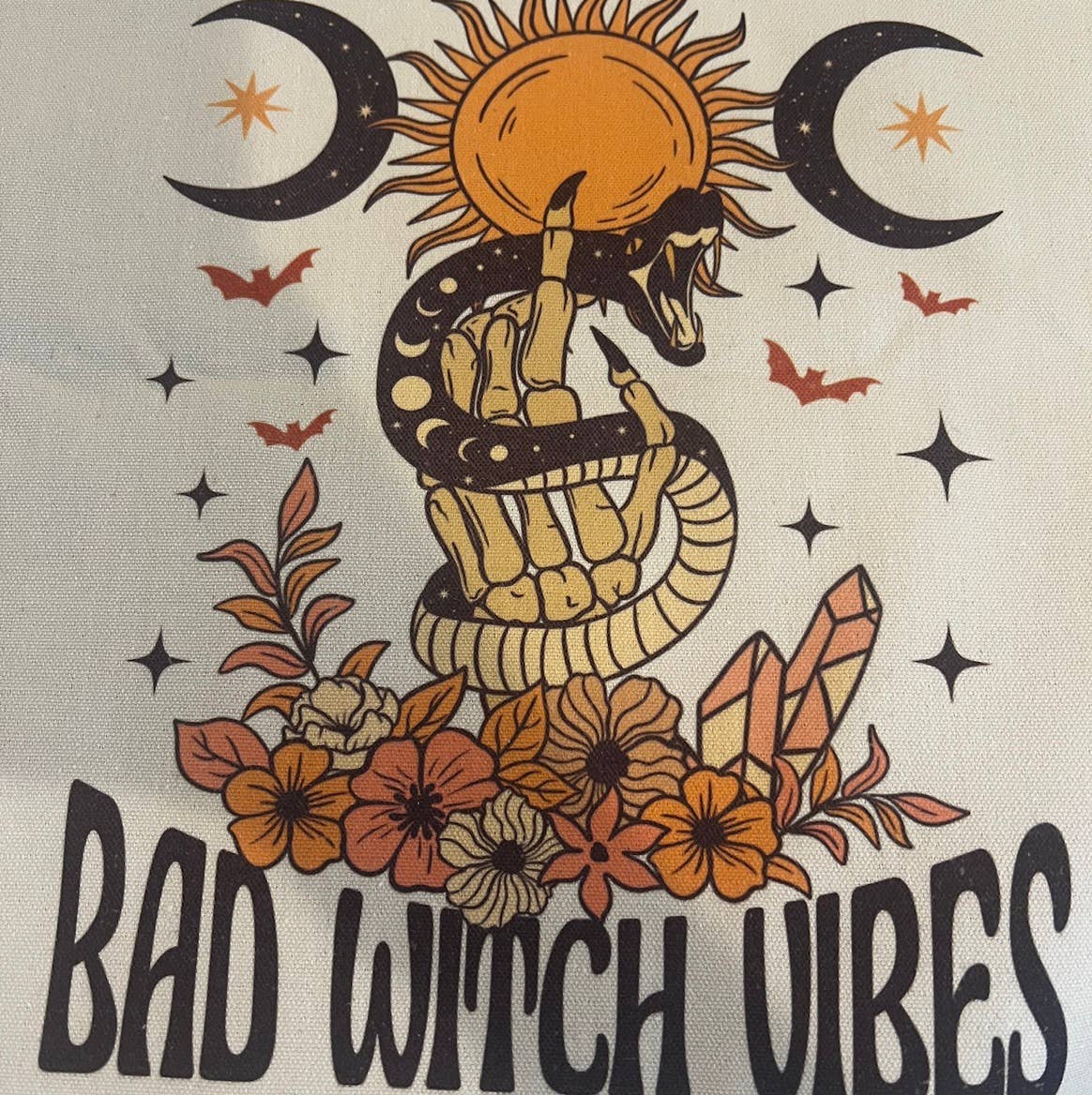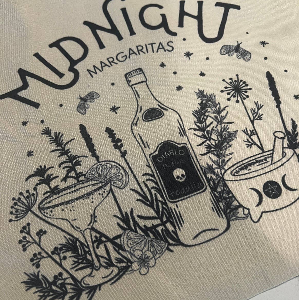 Midnight Margaritas Practical Magic Halloween Canvas Tote Bag 13 x 14 in. natural/off-white color canvas tote bag. A high quality printed image on one side of the tote. Two shoulder straps with a 9 in. drop make for a comfortable fit. We recommend spot cleaning this item to ensure a long lasting image. Color may vary on actual product due to differences in screen resolution. Hand printed with care in North Carolina.