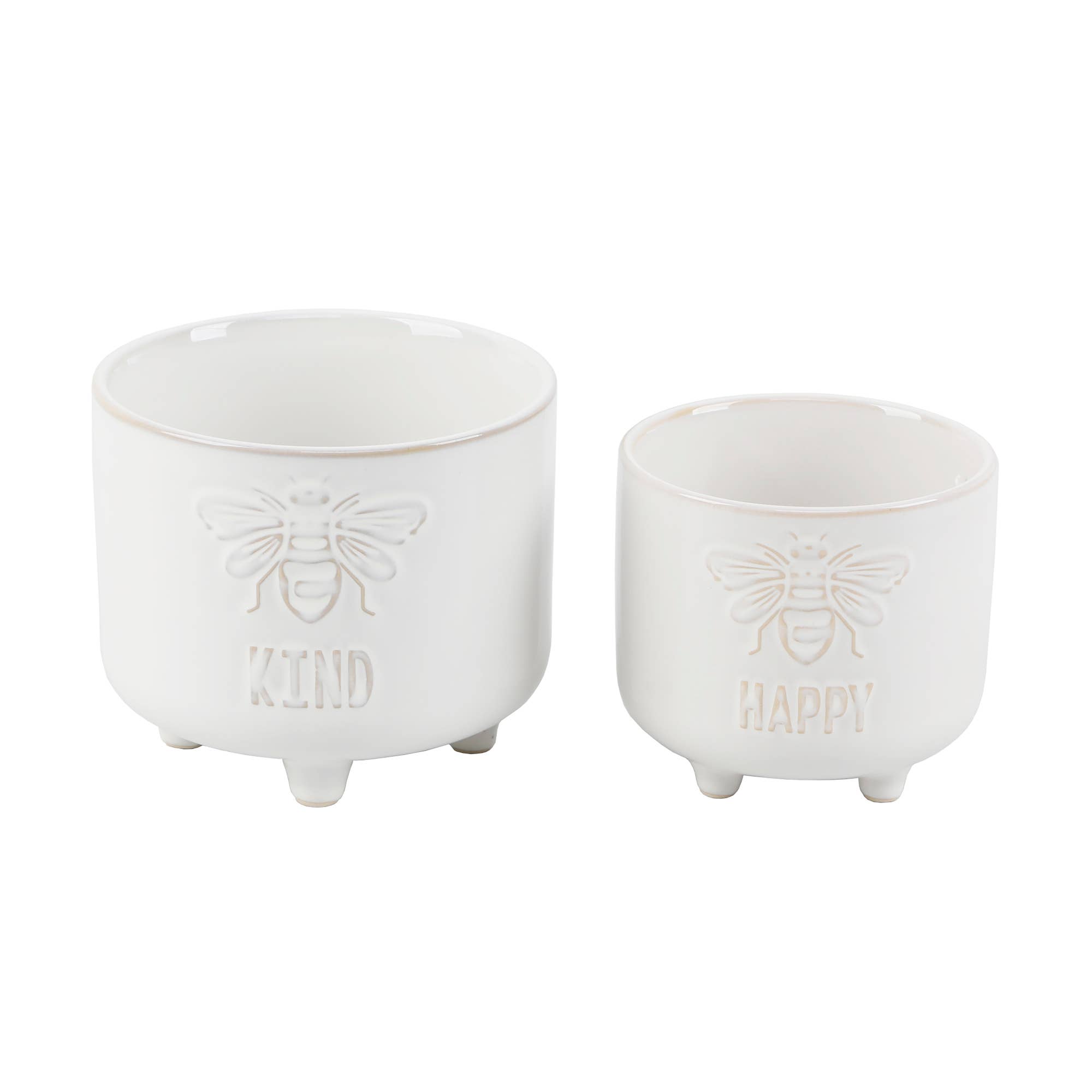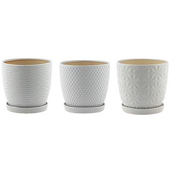 Bring a touch of whimsy and lightness to your décor with this Dragonfly Embossed Footed Ceramic Planter Set. Adorned with delicately raised dragonfly motifs, each planter captures the airy, nature-inspired charm of these graceful creatures. The clean white ceramic finish pairs beautifully with modern, farmhouse, cottagecore, and minimalist spaces, creating a soft and uplifting display wherever placed. This coordinated two-piece set includes a 6" diameter planter standing 5.125" tall and a smaller 4.75" diameter planter standing 4.25" tall. The rounded footed bases elevate each piece, giving your plants a stylish lift that enhances visual interest on tabletops, shelves, desks, and windowsills. Perfect for succulents, herbs, small plants, or faux greenery, these planters offer both decorative appeal and versatile function. Whether styled together for a cohesive vignette or used individually throughout the home, the dragonfly planter set adds a playful yet elegant touch—making it an excellent choice for boutique displays, thoughtful gifts, and curated home décor collections.