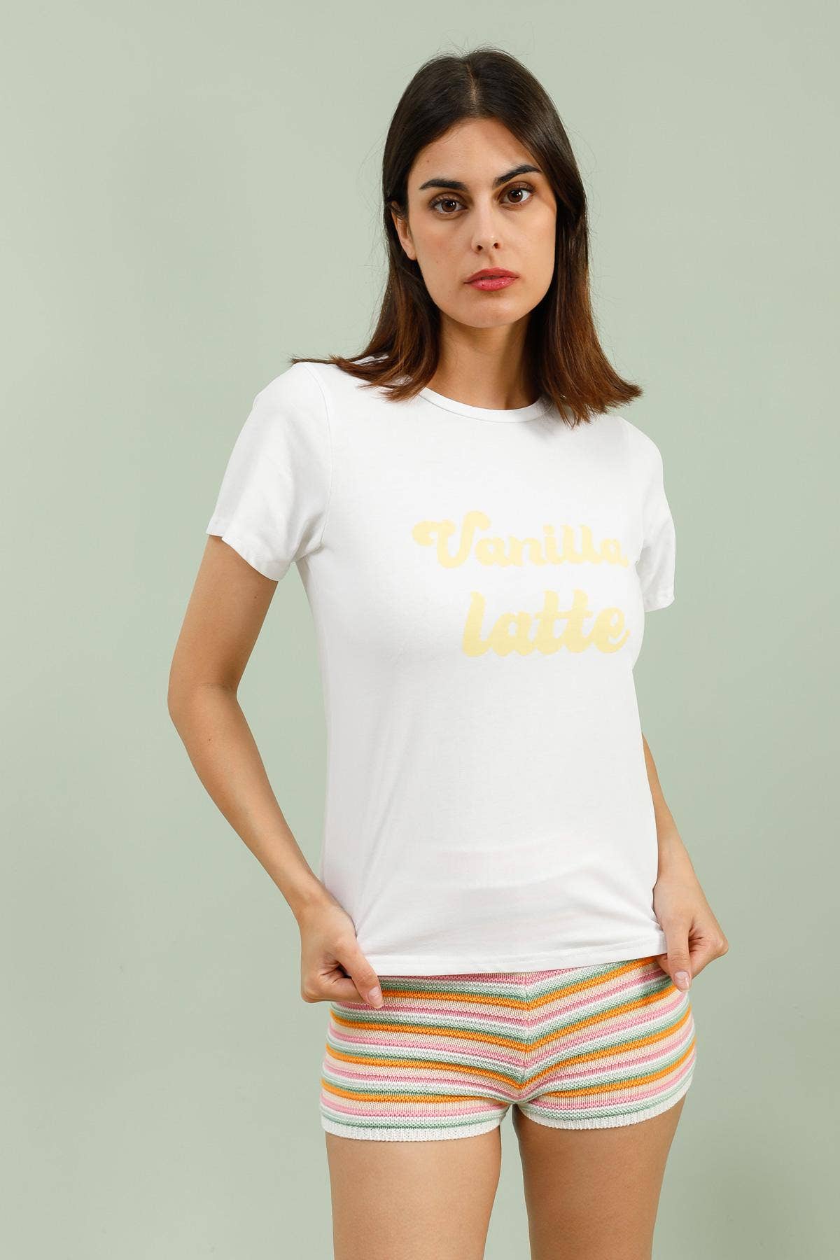 Solid color short-sleeve T-shirt with "Strawberry Milk" screen print Our model is 1.76m tall and wears a size S