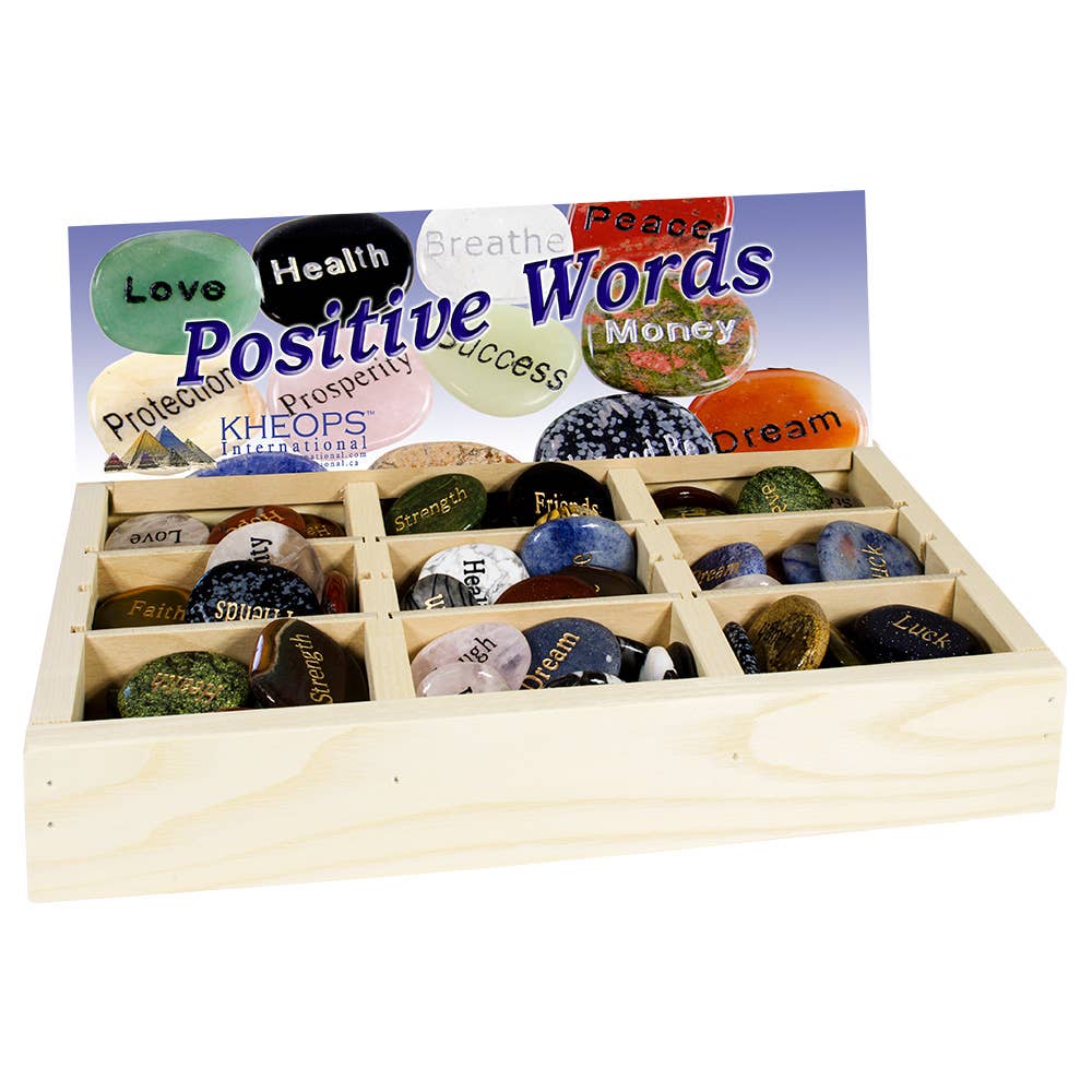Includes 95 Single word river rocks measuring approx. (2" to 3") with dough bowl display (13" x 9" x 3".) Stones will come in assorted words (over 70 words available) **Stone color choice is not an option. Stones come in a variety of earth tone colors. They vary in shape and size and may have organic details that are not flaws but naturally occurring blemishes and minor cracks. These are not defects, but the result of nature.** These river rocks are beautifully engraved in black and white ink. They make great gifts, party favors, and counter add-ons. Put a bowl near your counter and watch customers 'dig' through to find their favorite word. **Important** Dough bowl displays are hand made items, and measurements are not exact. Also, please note that the bowls are made to look rustic and may have knot holes, scratches, blade marks, minor cracks and blemishes. These are not defects, but part of the bowl making process. Bowl will come in natural wood or painted white. Dough bowls are for decorative and display use only. It has not been treated or tested for food safety. It is not rated for candle making or exposure to flame or heat.