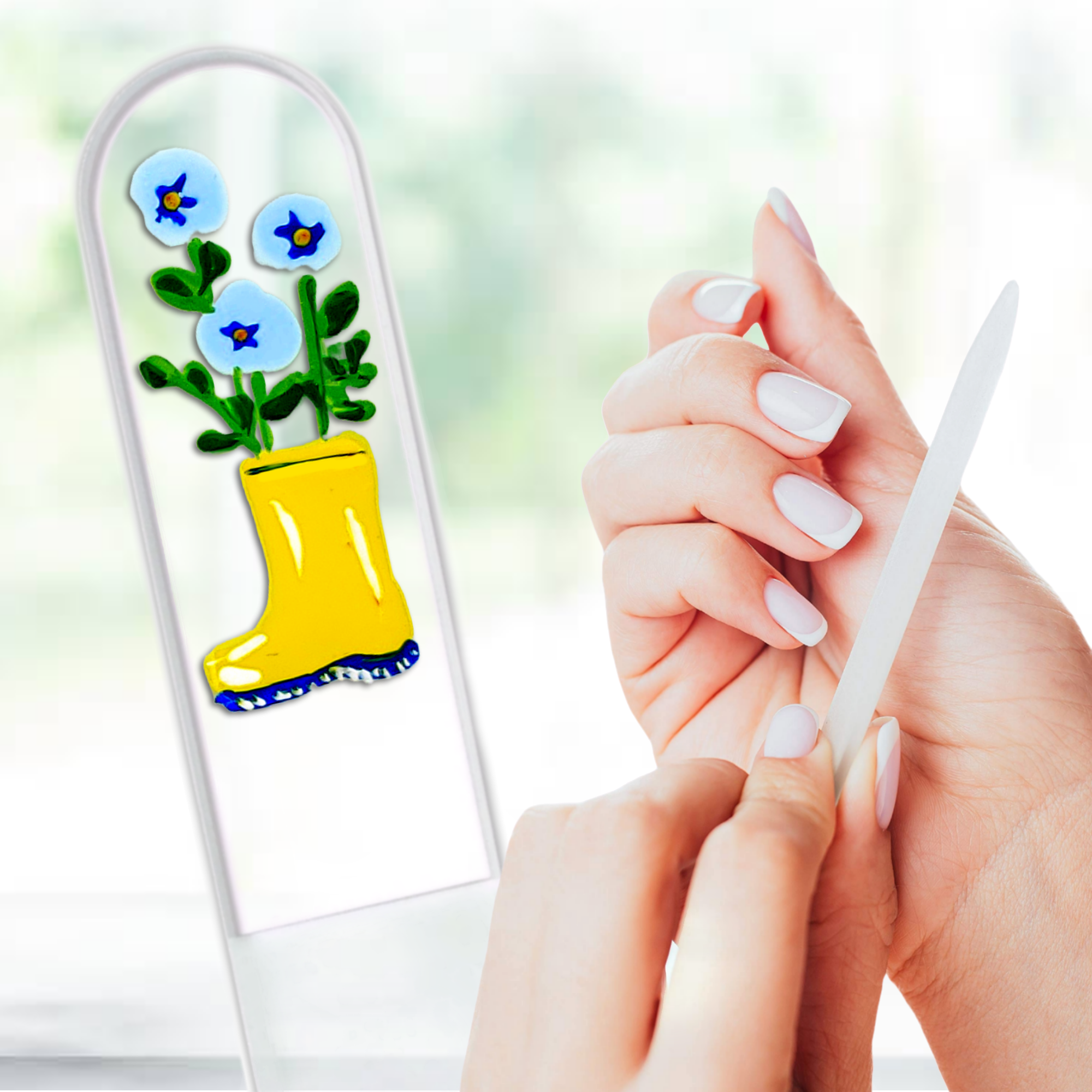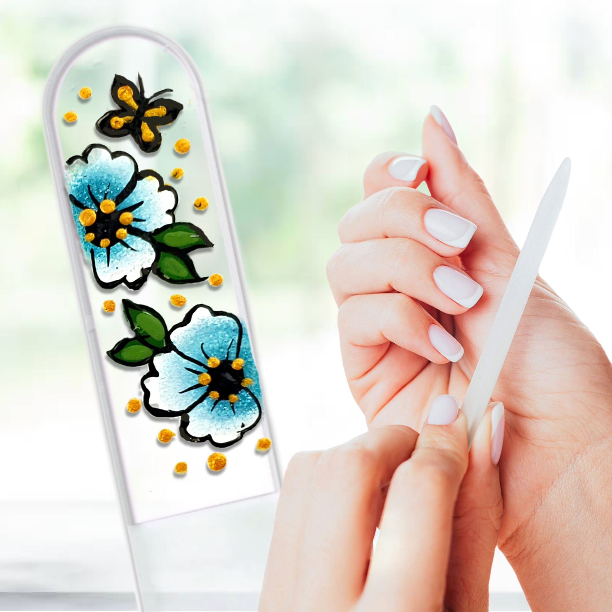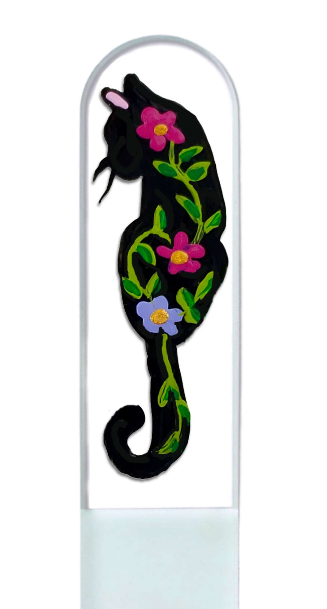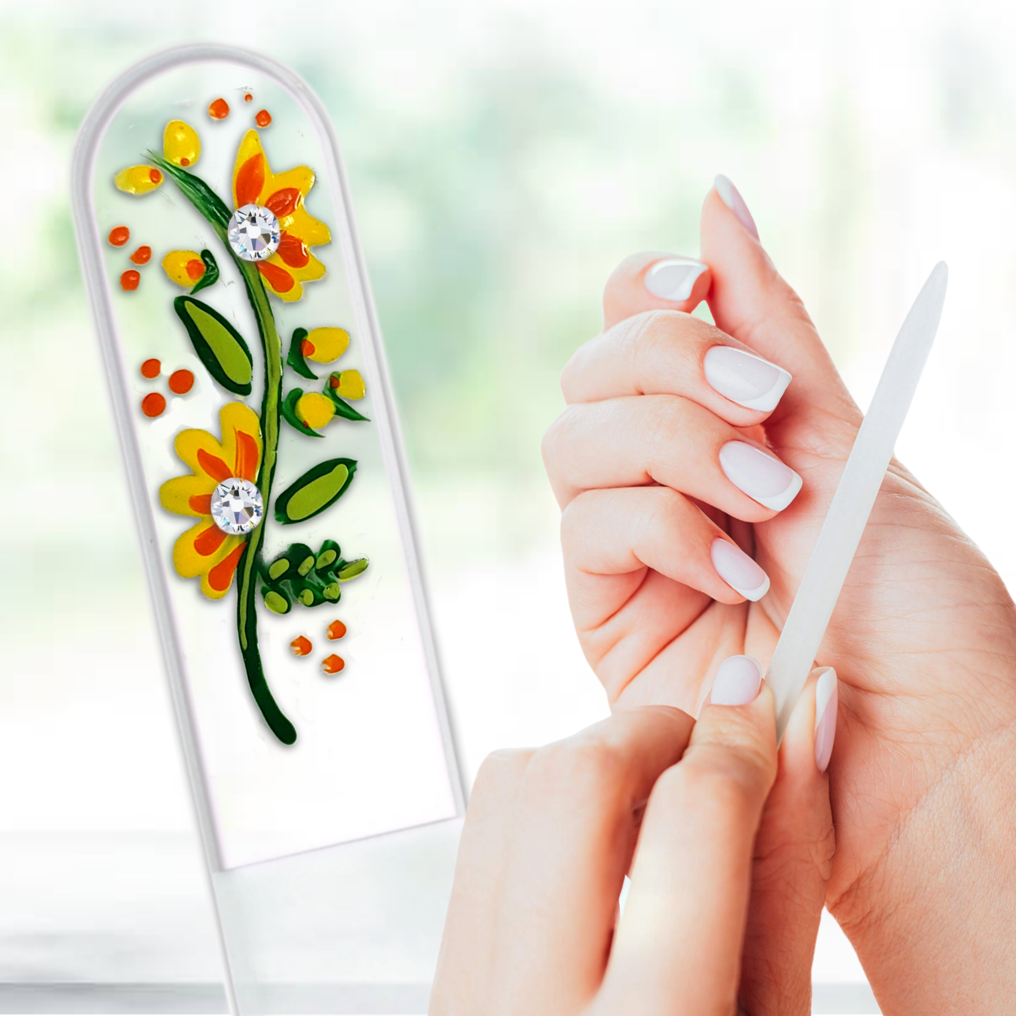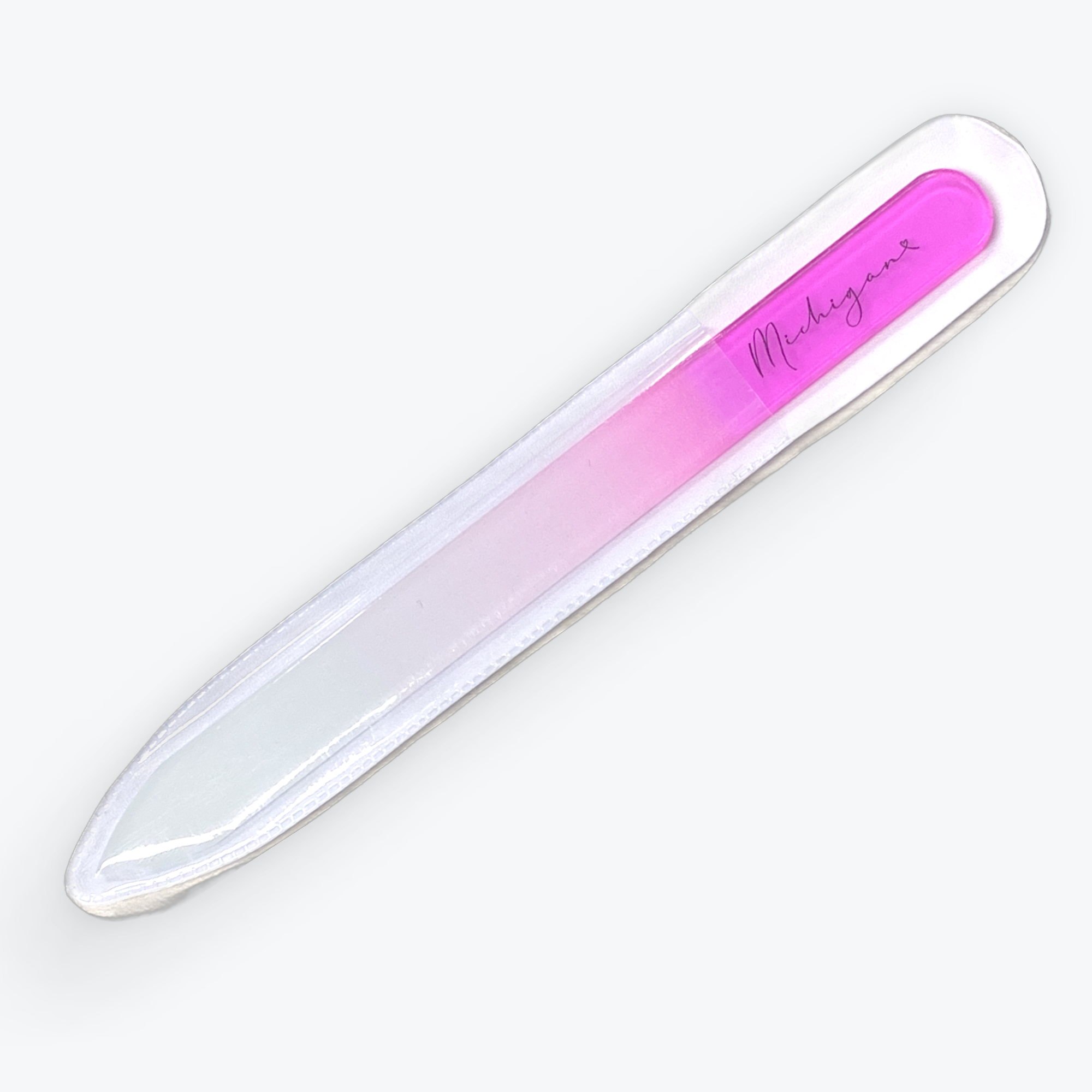 Glamorous, yet durable hand painted, crystal glass nail files come in three sizes. Small for purse and travel needs, Medium for everyday and Large for feet and pedicures! These are the gifts that give the finish of a lifetime, for a lifetime. Perfect for gifts, teachers, stocking stuffers or for yourself! Our European crystal files feature a filling surface etched permanently in the glass for a superior longevity and performance. The crystal is tempered and hardened, making it 74% stronger than ordinary glass. Files are double sided, easily sterilized, and give a superior finish on natural and artificial nails. A clear plastic sheath is included with every nail file. We carry a full line of vibrant colors and hand painted designs. We are proud to inform you that all our hand painted designs are painted by local artists right here in Grand Rapids, Michigan (USA)!