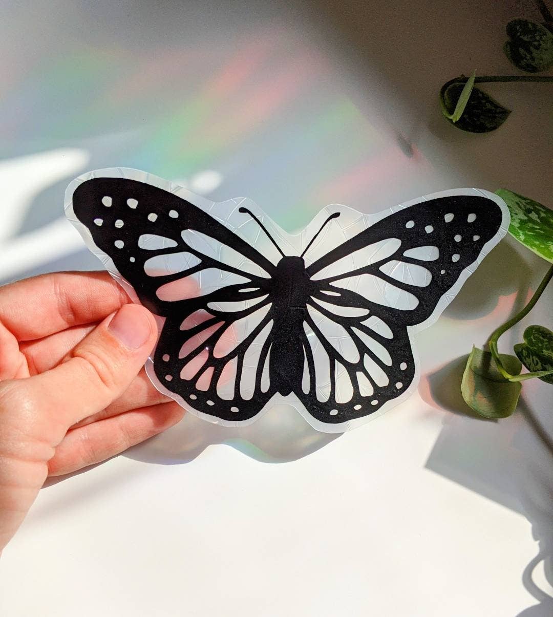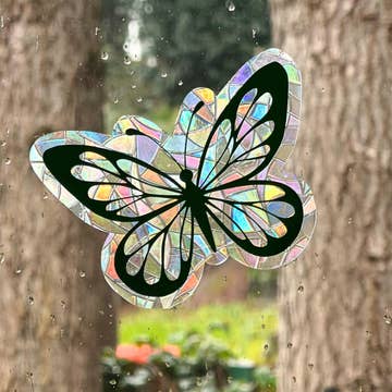 BUTTERFLY SUNCATCHER WINDOW CLING 🦋 🦋 Butterfly Suncatcher with your choice of vinyl color of sunflower outline 🦋Choose Your Size: 5" 6.5" ☀️ This suncatcher will capture the sun's rays and turn them into bright rainbows throughout your room or in your car! ☀️ Window clings look amazing on glass doors, windows in bedrooms, kitchens, living rooms, etc., mirrors, and even on indoor car windows and sunroofs! ☀️ Easy to apply and remove, leaving no traces, and can be reused many times. These decals are applied with static cling, no glue or adhesive is needed. ☀️ Installation instructions are included, however, please note the backing film must be PEELED OFF before sticking to windows, or the suncatcher will fall off when the application water is dry.