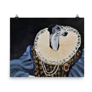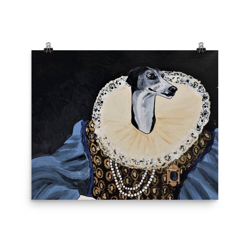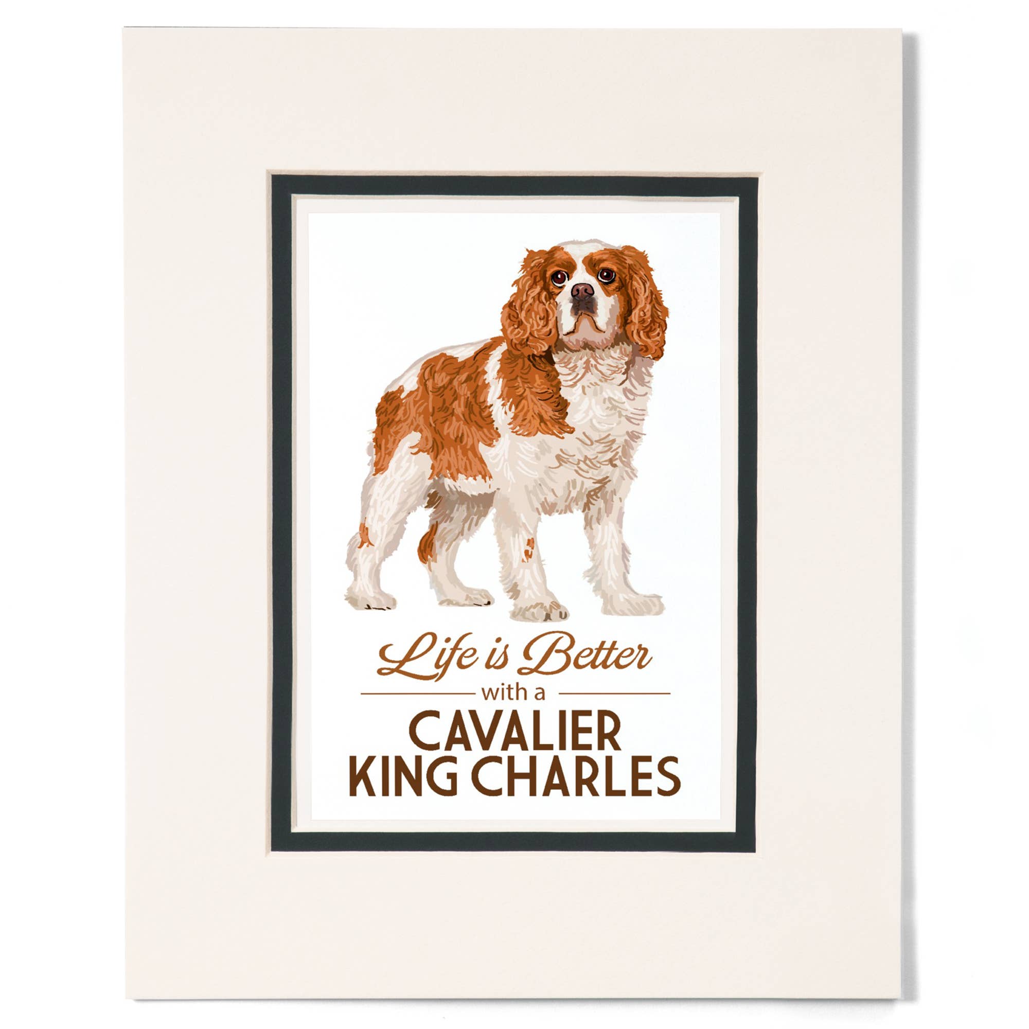 Cavalier King Charles Spaniel Dog Art Print, King of Everything, Brown and White Edition This art print features a Cavalier King Charles Spaniel in the pose of a Royal Portrait with the phrase "King of Everything". Funny artwork for the King Charles lover! "Charlie is the benevolent ruler of his kingdom. The park, the yard, the house - there is no place his rule does not reach- but if you offer to scratch his belly he will gladly share his couch with you... and if you are good, maybe later you can throw him a royal ball." Choose from 4 coat colors: Blenheim (brown and white fur); Tricolor; Black and Tan; or Ruby (brown). These high-quality giclée prints are printed on archival fine art paper and finished with an acid-free mat. Each print comes with a tag on the back and includes a small humorous description of the character. Choose from Sizes: 1. A 5x7 art print matted to an 8x10 size. 2. An 8x10 art print matted to an 11x14 size. No frames are included.