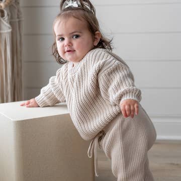 •100% cotton •Nothing says cozy like our knit Pants! •Pair it with our matching chunky sweater+Beanie to complete the look. •With a relaxed fit and comfy elastic waistband, your kiddo will feel like they're snuggled up in a cloud. •Perfect for lounging & playtime. C'mon, what are you waiting for? Let your little one cuddle up and get comfy!
