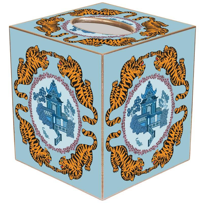 The Paper Mache Kleenex Box measures 5.5 x 5 inches and features a charming chinoiserie vase design, with leopards supporting it with their tails! This item can be customized with pictures or designs for any occasion. For a fun twist, you can even use it as a whimsical vase!
