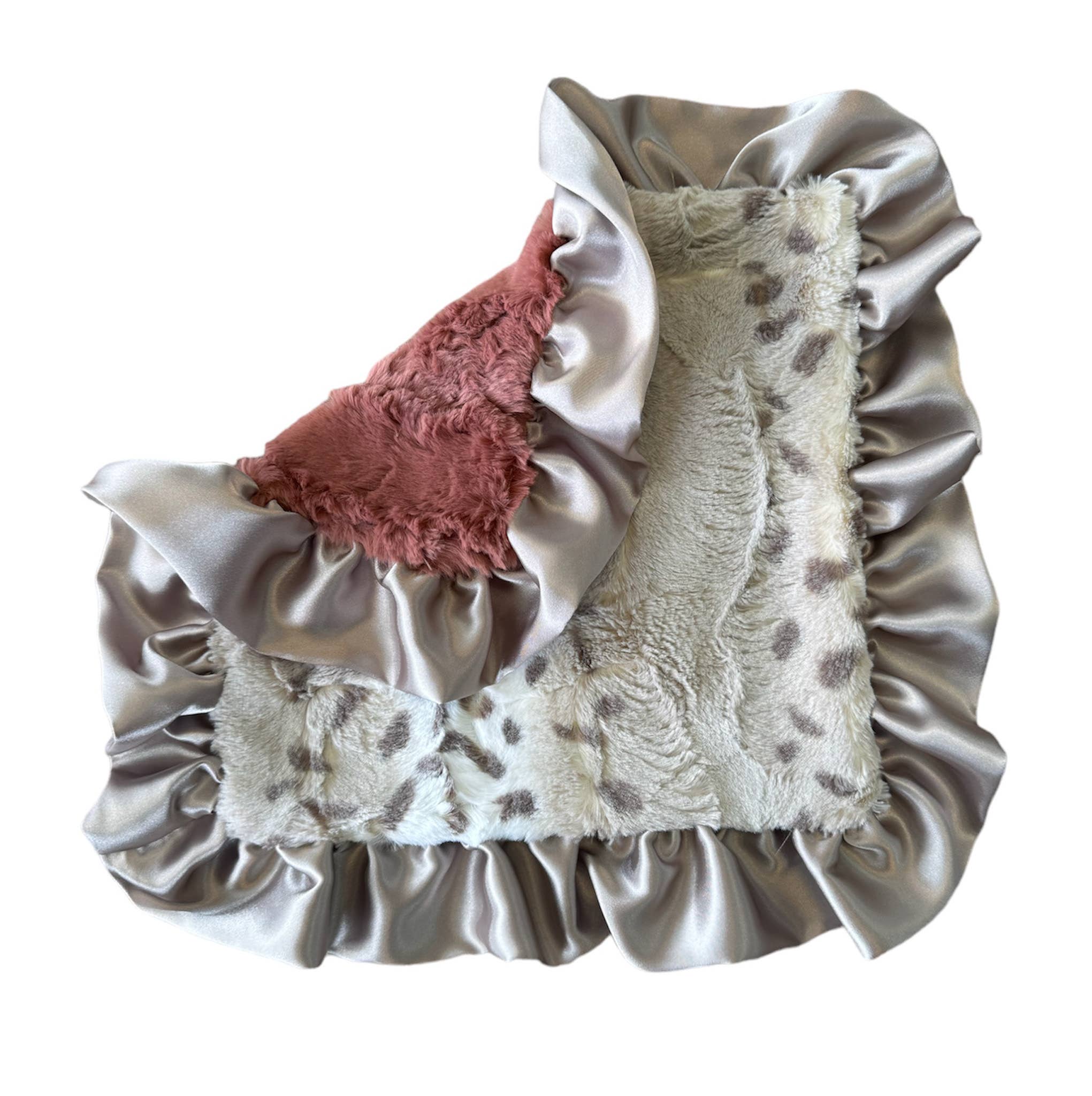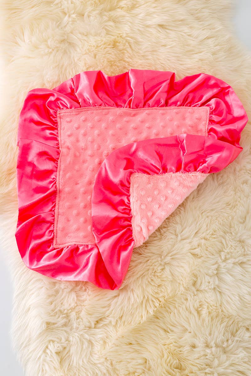 This luxurious plush blanket is framed with a silky satin ruffle. It measures approximately 34" x 34" and is made in the USA.
